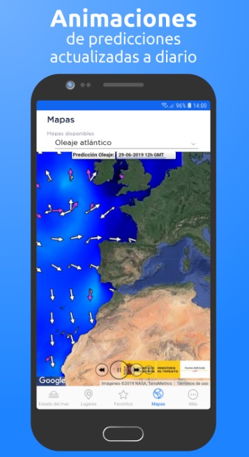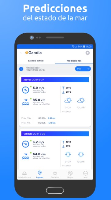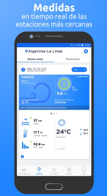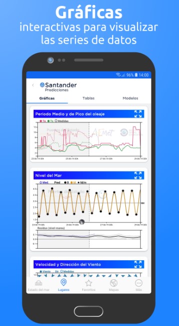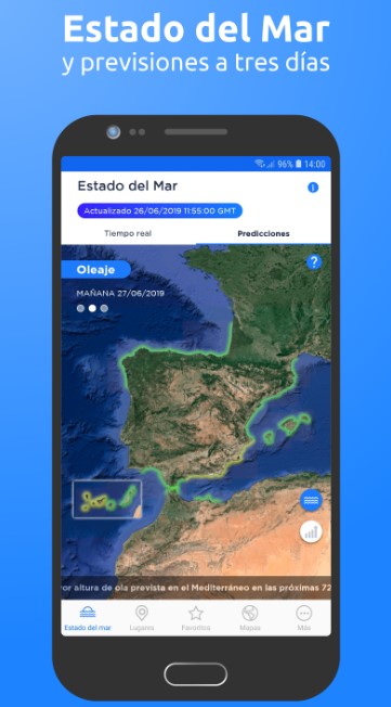 Aplicación que permite conocer el estado del mar, tanto en tiempo real como para los próximos días. Ofrece información detallada de oleaje, nivel del mar, viento, presión atmosférica o temperatura del agua, entre otros, para cada localidad, playa y puerto de España. Además, permite la creación y gestión de ubicaciones favoritas, lo que facilita un acceso inmediato a los datos disponibles.