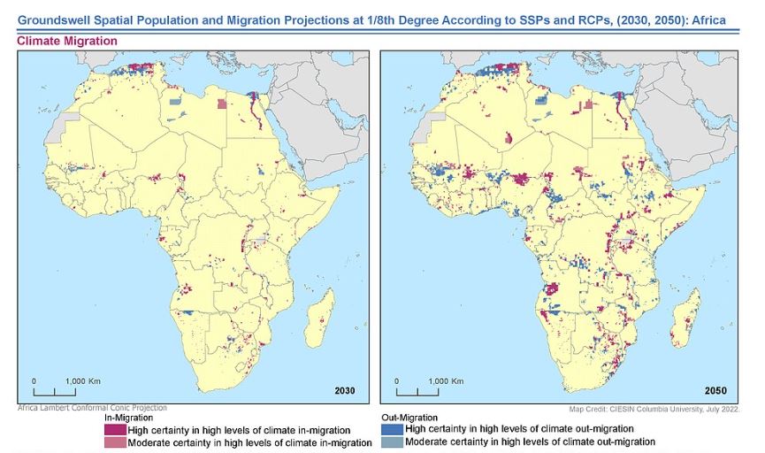 - Las Proyecciones espaciales de población y migración de Groundswell son un conjunto de datos que proporciona una distribución de población de refrencia para 2010 y proyecciones de 2020 a 2050, en incrementos de diez años, de distribución de población y clima interno. Las proyecciones se obtienen utilizando el modelo de reducción de escala de población espacial NCAR-CIDR desarrollado por el CUNY Institute for Demographic Research (CIDR) y el National Center for Atmospheric Research (NCAR). El modelo incorpora suposiciones basadas en escenarios de desarrollo futuro (vías socioeconómicas compartidas o SSP) y trayectorias de emisiones (vías de concentración representativas o RCP)