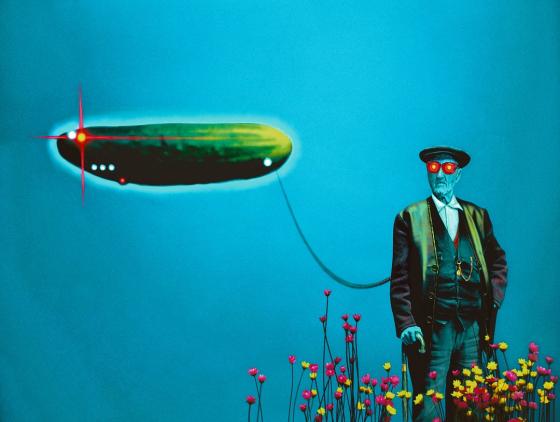 El campesino postnuclear o alienígena de ojos con llamaradas refulgentes que cohabita con su cayado junto a un pepinazo convertido en dirigible, parece encarnar el combate entre la ancestral España rural de boina y reloj colgando de la chaquetilla enfrentada al advenimiento de una esotérica transformación que convertirá a los pepinos –y a la sociedad española postfranquista– en otra cosa.