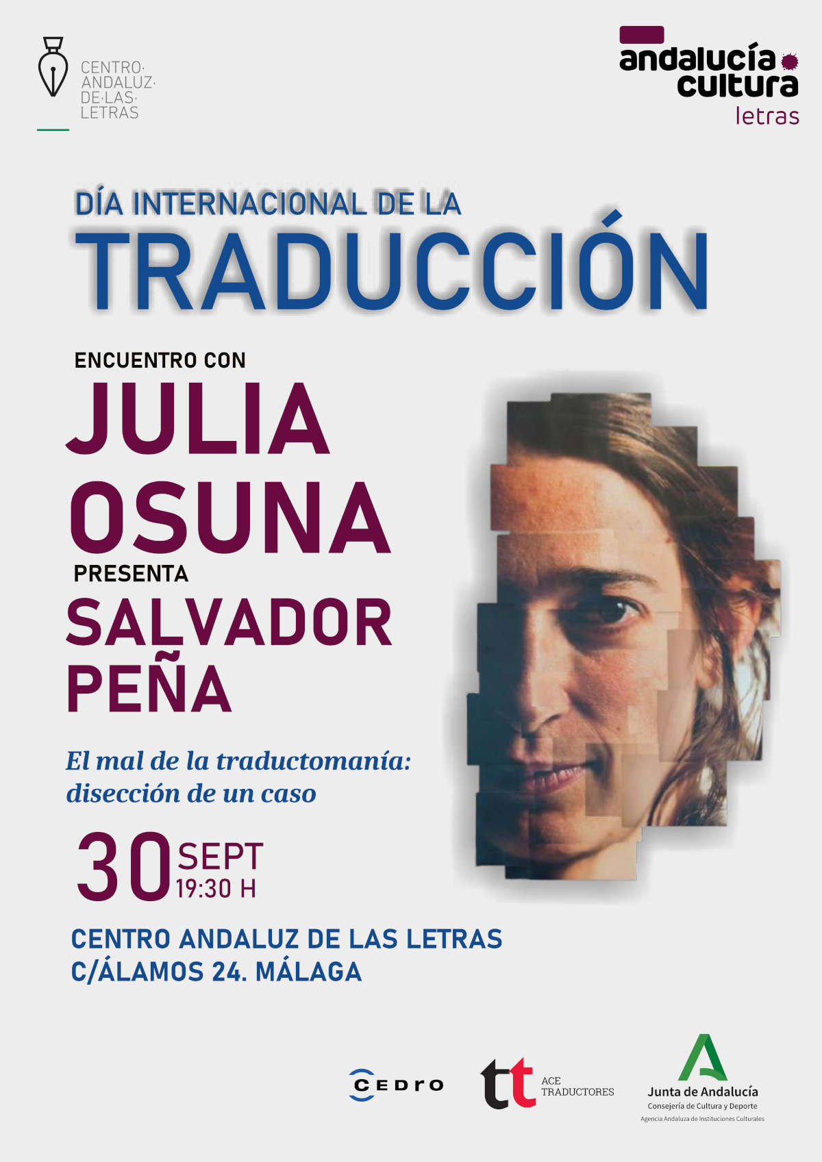 La Consejería de Cultura y Deporte, a través de la Agencia Andaluza de Instituciones Culturales, programa el encuentro 'El mal de la traductomanía: disección de un caso' en el Centro Andaluz de las Letras con motivo del Día Internacional de la Traducción. El evento, organizado en colaboración con la ACE-Traductores, estará presentado por el profesor de lengua árabe y traducción en la Universidad de Málaga, Salvador Peña que conversará con la traductora, Julia Osuna Aguilar, ambos con una dilatada y reconocida trayectoria en el mundo de la traducción. La cita es el próximo lunes 30 de septiembre a partir de las 19:30 en la sede del Centro en la Calle Álamos 24, Málaga.