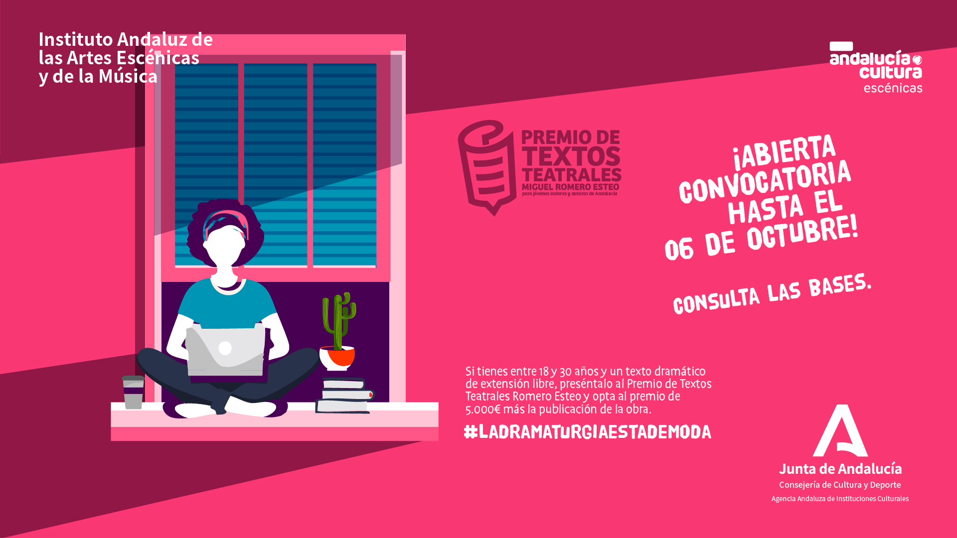 La Consejería de Cultura y Deporte ha publicado hoy en el Boletín Oficial de la Junta de Andalucía la convocatoria para concurrir al Premio de Textos Teatrales Miguel Romero Esteo (BOJA núm. 162 de 2025). Con un único premio de 5.000 euros y hasta dos áccesit de 1.500 euros cada uno, podrán presentarse, hasta el próximo 6 de octubre, textos inéditos y de carácter literario teatral, escritos por autores y autoras andaluces con edades comprendidas entre los 18 y los 30 años.