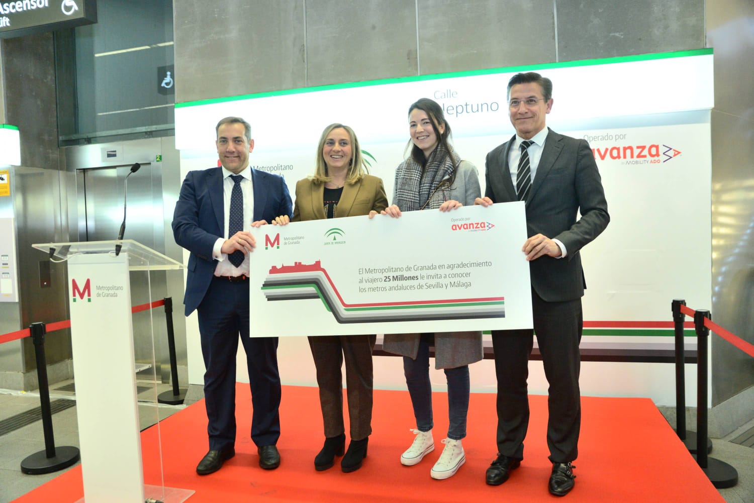 La consejera de Fomento, Infraestructuras y Ordenación del Territorio, Marifrán Carazo, junto al alcalde de Granada, Luis Salvador, han estado presentes hoy en la estación de Recogidas donde se ha obsequiado al usuario 25 millones con una tarjeta del metro con 100 euros de recarga, así como la posibilidad de conocer los otros dos metros andaluces de Sevilla y Málaga.