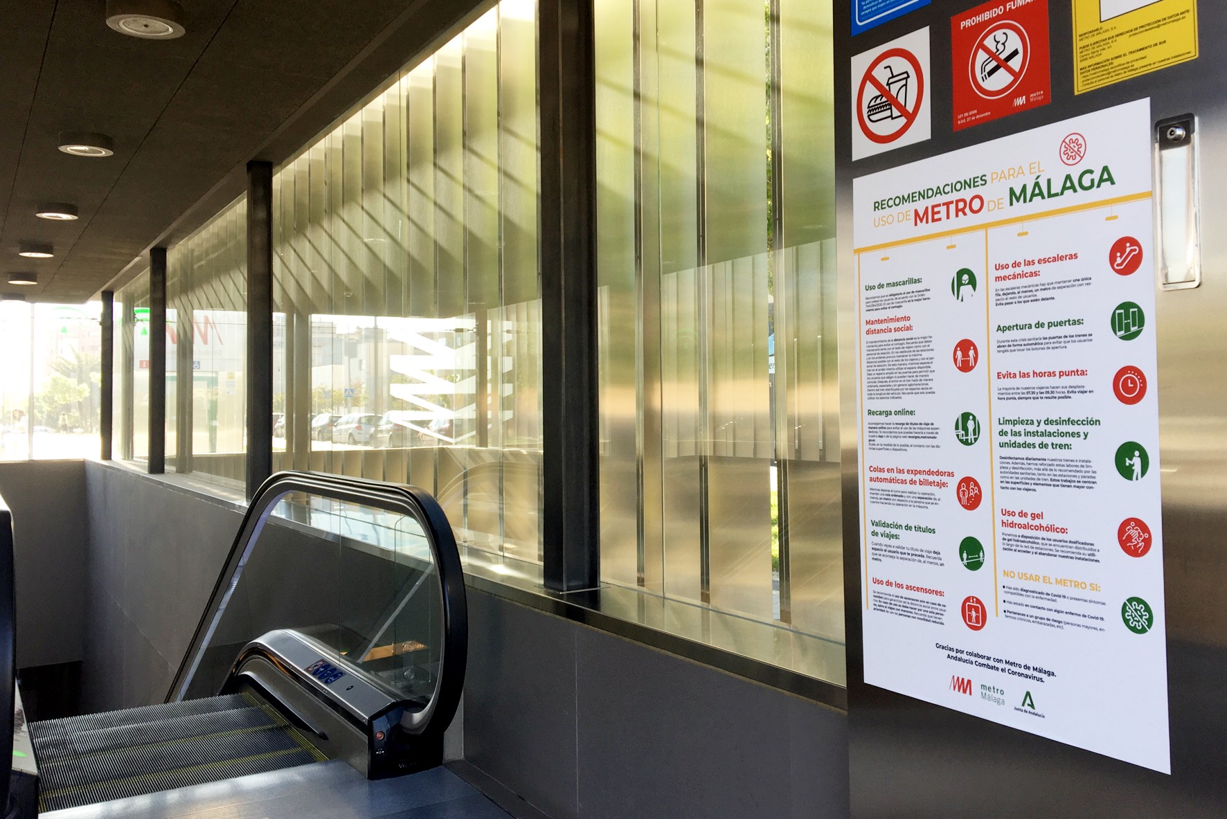 La nueva señalización de los metros de Sevilla, Granada y Málaga, adscritos a la Agencia de Obra Pública, se ha colocado en diferentes puntos del suelo de las estaciones, como la zona de espera de llegada del tren y de uso de las máquinas expendedoras, los accesos a escaleras o ascensores y la entrada y salida de los tornos. También se han colocado en el interior del tren señales para ayudar a distribuirse en los asientos y limitar a la mitad el aforo. Por últmo, se han instalado carteles con las recomendaciones de viaje y la obligatoriedad establecida por el Gobierno de España del uso de mascarilla.