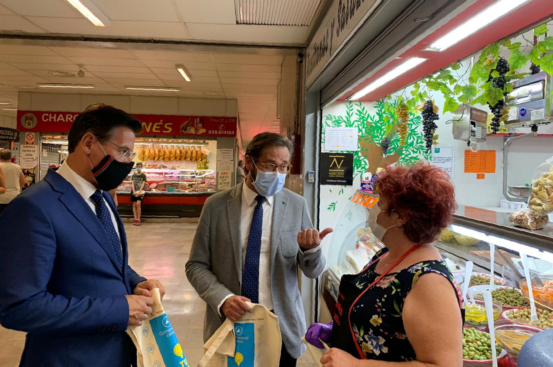 El delegado territorial de Fomento, Antonio Granados, acompañado del alcalde de la capital, Luis Salvador, ha recorrido hoy el Merca 80, donde se ha iniciado el reparto de 4.000 bolsas de algodón orgánico reciclado para las compras entre los establecimientos y locales, que llevan impresa la imagen y eslogan de la campaña: Comprando cerca, tu barrio llega más lejos.