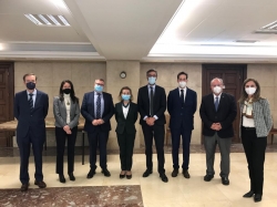 Ángel J. Gallego Morales, junto a la presidenta del CES de Extremadura, Mercedes Vaquera Mosquero, y el presidente del CES de Castilla y León, Enrique Cabero Morán, han mantenido una reunión de trabajo con el subdirector general de Planificación, Red Transeuropea y Logística, Juan Pedro Fernández Palomino, y con el subdirector general adjunto de Relaciones Internacionales, Luis Borja Condado Castaño, entre otros altos cargos del Ministerio de Transporte, Movilidad y Agenda Urbana.