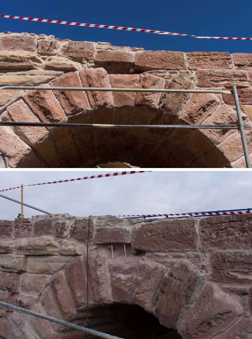 – El aparejo utilizado en la consolidación de dovelas fue distinto, ya que se colocó siguiendo la misma lógica estructural que las piezas a las que refuerzan, en abanico.
