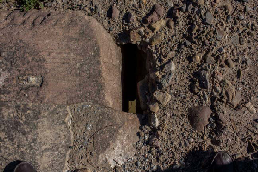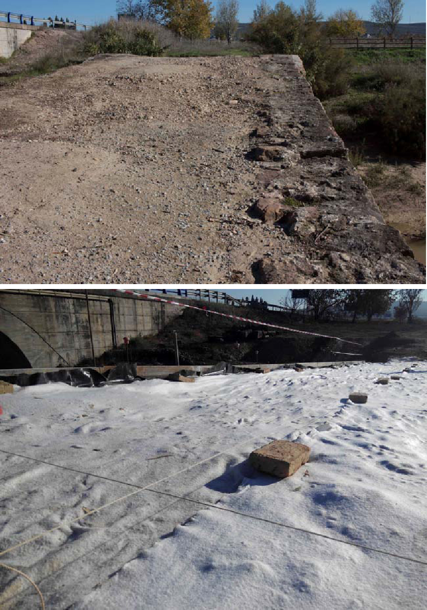 Para proteger el tablero y la fábrica cubierta por él se ejecutó una solera de mortero de cal de diez centímetros de espesor sobre un lecho de arena estabilizada con cal, extendida sobre un geotextil que separa la actuación del substrato. En los bordes de la solera se extendió una lámina plástica sobre los sillares y se llevó el mortero hasta dicha lámina. De esta manera se evita que la arena se lave y se comprometa la durabilidad de la solución, sin tocar en ningún punto la fábrica ni el substrato.