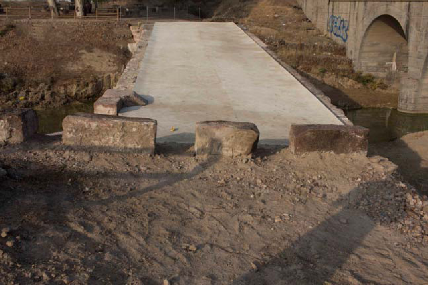 Otro de los trabajos realizados consistió en la retirada de la losa de hormigón situada bajo el arco occidental, por encontrarse fragmentada y presentar riesgo de dañar la estructura del puente. No se realizó, sin embargo, la retirada de la del arco oriental, estable y en perfecto estado.