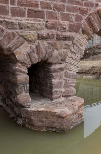 – En los lugares en los que no era posible introducir ladrillos o medios ladrillos, se utilizaron cantos rodados encontrados en el entorno del puente, que son los mismos empleados en reparaciones anteriores. Estas piezas más pequeñas permiten rellenar juntas lavadas de menor espesor que pueden ser muy profundas y desestabilizar tanto como las mayores, muy visibles.