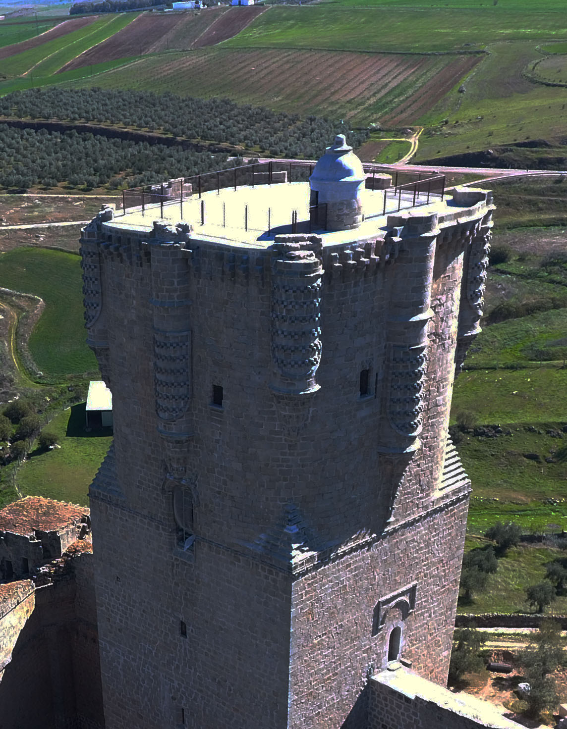En la parte más alta del cerro se alza el castillo señorial cristiano, de planta cuadrangular, con torres macizas en las esquinas y otras con estancias interiores en el centro de los lienzos. Fue construido en sillería de granito. La Torre del Homenaje domina el espacio con sus 47 metros de altura. Se inicia con una planta cuadrada que en su tercio superior evoluciona a formas redondeadas, decorándose con ocho escaraguaitas o garitones semicilíndricos escalonados adornados con el escudo de los Sotomayor sobre elementos góticos.