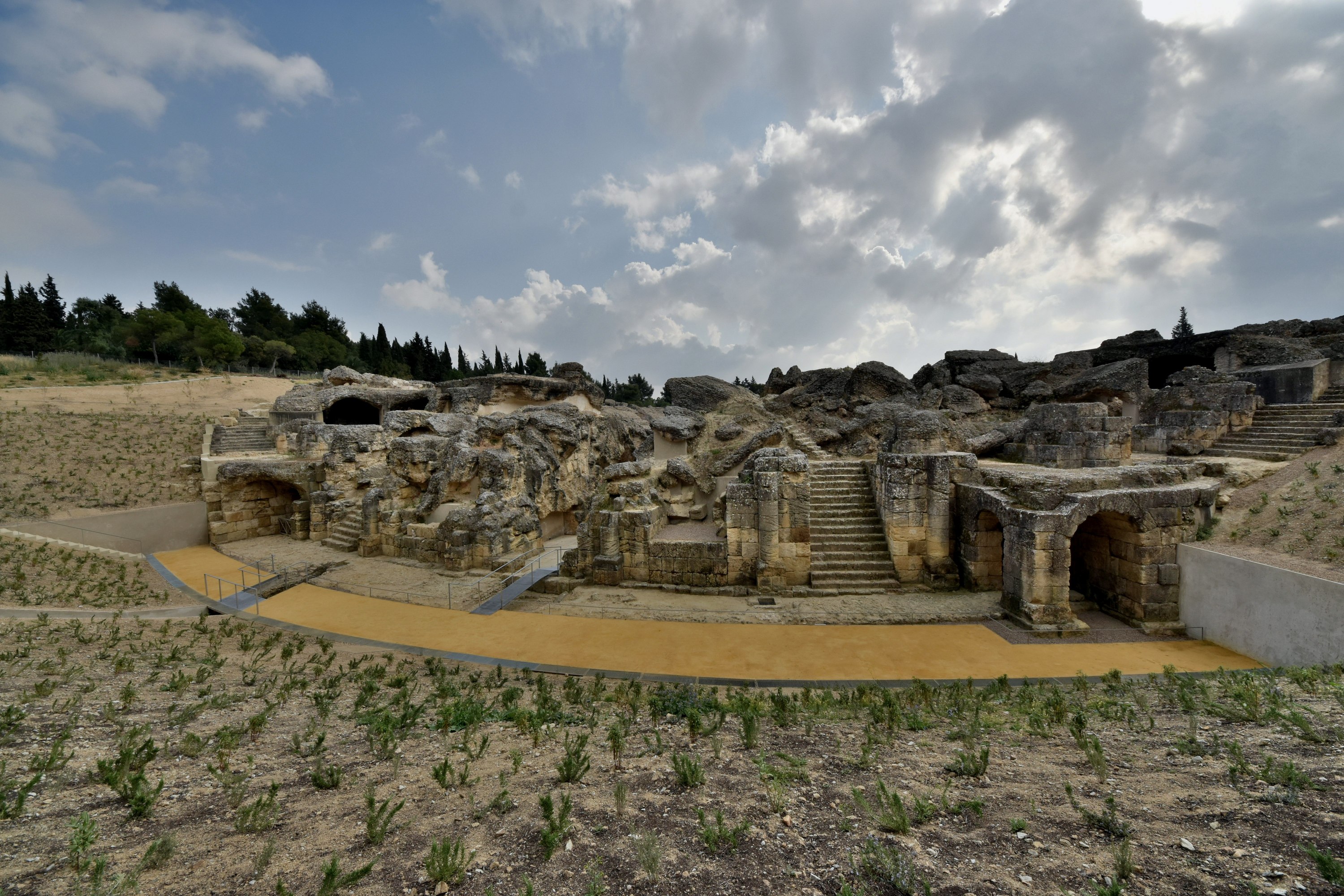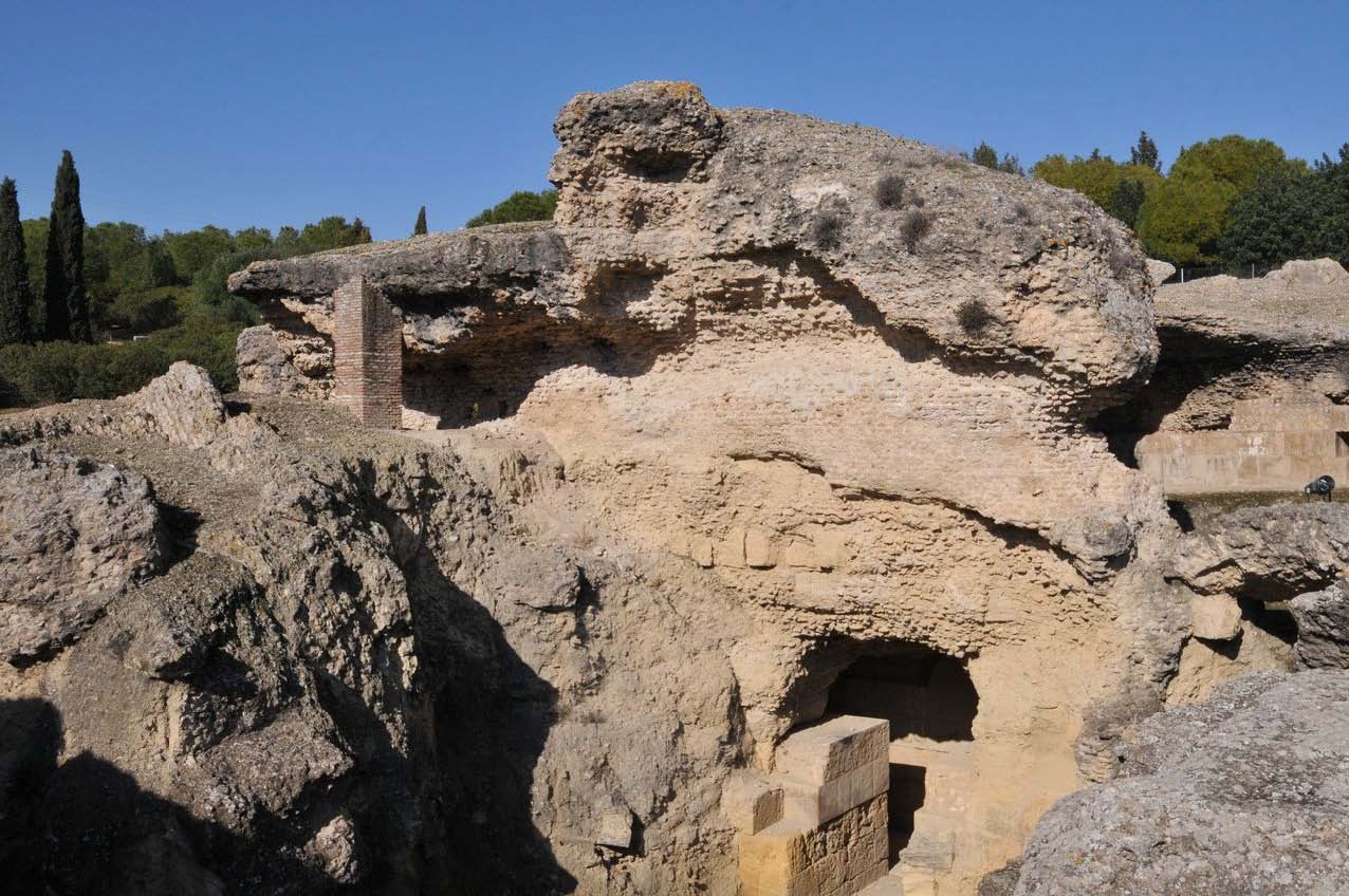 El anfiteatro de Itálica, construido en época del emperador Adriano, se encuentra entre los mayores del Imperio romano. Miden sus ejes principales 152,8 m por 130,6 m, y los de la arena 70,6 m por 47,3 m. Su aforo aproximado era de unas 20.000 a 25.000 personas.
