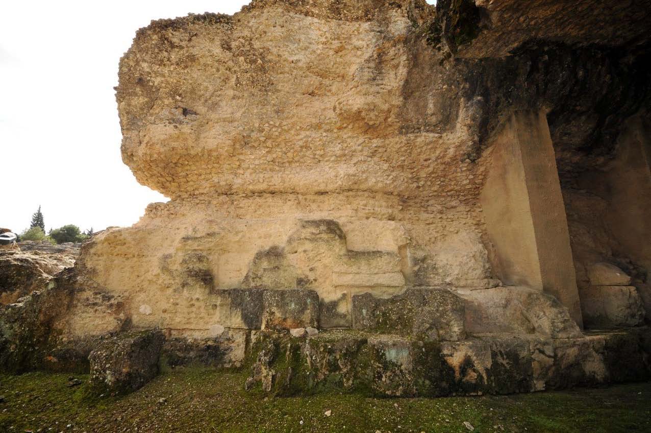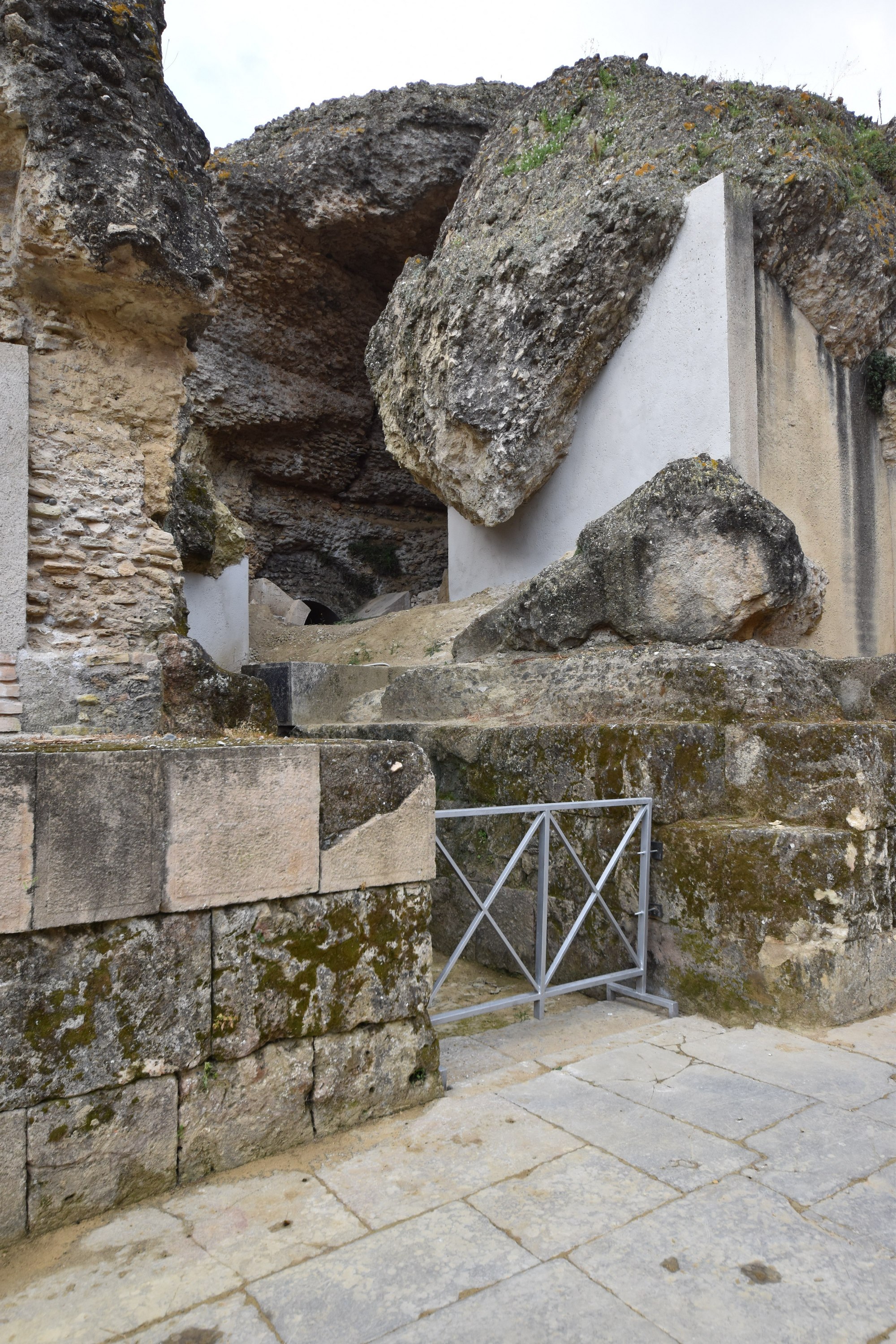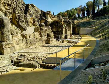 Se han actualizado los sistemas de contención en el encuentro con el edificio, se ha llevado a cabo una reordenación del sistema de drenaje -que permite encauzar la evacuación de aguas a través de las cloacas romanas- y se han construido pasarelas y caminos perimetrales de acceso y recorrido público. Las nuevas sendas se asocian al trazado del sistema de drenaje proyectado, que se dota de canalizaciones para preinstalación de electricidad (futura iluminación monumental y balizamiento) y riego.