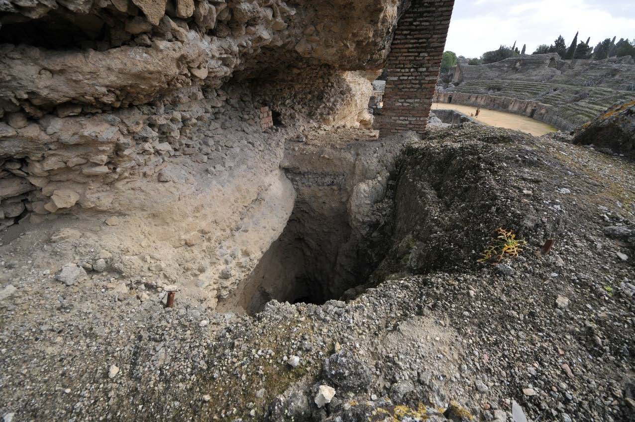 La zona oeste del anfiteatro, en la que se centra la intervención, evidencia el largo proceso de expolio y explotación como cantera de material de construcción del que ha sido objeto el edificio. Una dinámica que ha originado, por un lado, la rotura y el vuelco de grandes elementos constructivos, generalmente trozos del graderío, que han quedado apoyados unos sobre otros o directamente sobre escombros y tierra en situación inestable, y, por otro, la existencia de elementos estructurales parcialmente destruidos (bóvedas y arcos). La pérdida de los sillares que conforman las hojas exteriores de los muros ha dejado la estructura interior de opus caementicium (núcleo de hormigón romano) en contacto con los agentes atmosféricos, provocando la disgregación del material y el desprendimiento de elementos de mampostería.