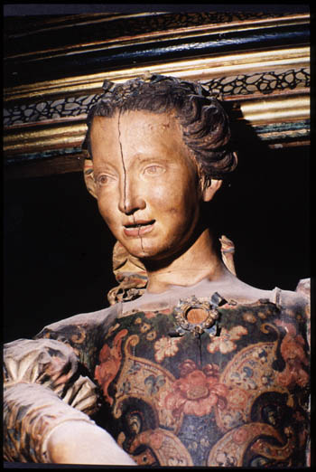 Se efectuó una media limpieza de las esculturas, entretenida por la infinidad de entrantes y salientes, que permitió recuperar una mayor riqueza, luminosidad y matices de la policromía.