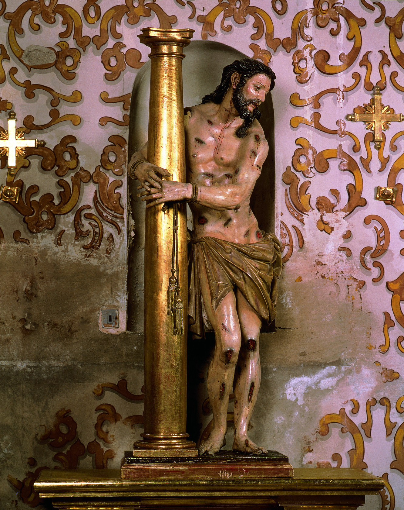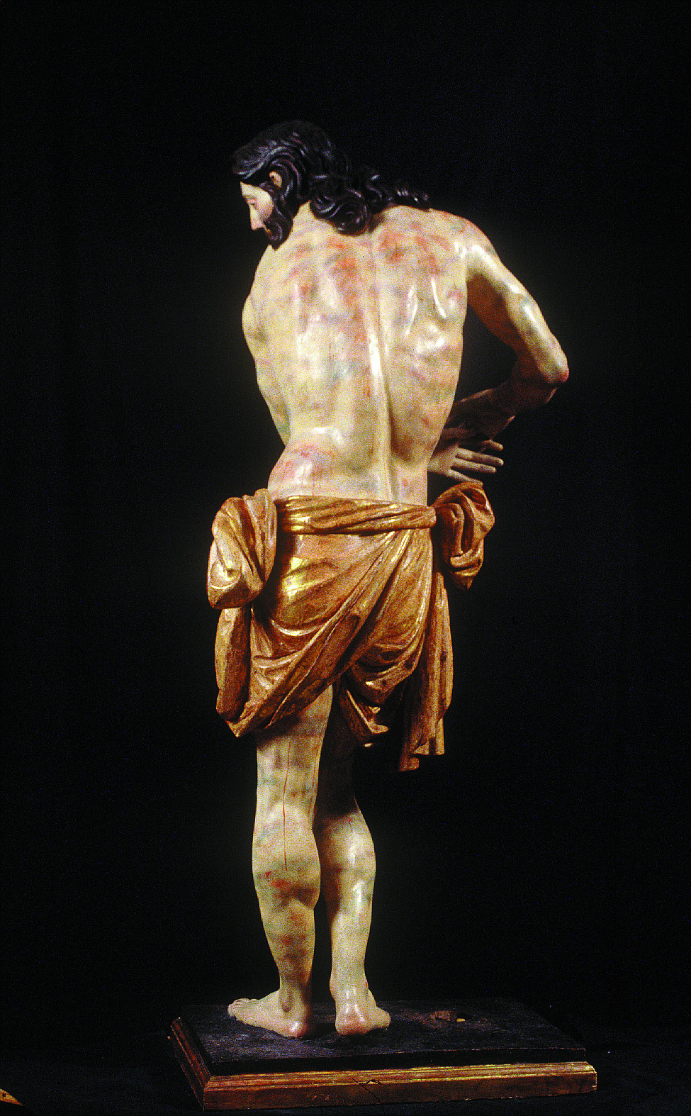 La crítica especializada atribuye su autoría a Pablo de Rojas en base a los paralelismos estilísticos con la obra documentada del artista. Técnicamente es una escultura de bulto redondo en madera policromada, realizada con diversos fragmentos de madera encolados formando el embón; la columna y la peana son piezas de madera independientes. La cuerda que ata las manos es de hilo metálico, rematada por dos borlas del mismo material. Se encontraba repolicromado, pero en la restauración efectuada se ha descubierto la policromía original, realizada, casi con seguridad, por Pedro de Raxis, colaborador habitual de Pablo de Rojas. Es una policromía al óleo con acabado al pulimento, trabajada a base de finas veladuras con una base de preparación blanca de espesor grueso constituida por dos capas de blanco de plomo con pequeñas cantidades de bermellón, laca y azurita artificial, aplicada directamente sobre la madera. Encima de esta policromía, que, en ocasiones, se encuentra removida, tal vez por limpiezas excesivas, existía un grueso repinte realizado en técnica mixta óleo-proteína, a base de blanco de plomo con bermellón y tierras. Las grandes heridas que tenía correspondían a repintes de diferentes épocas. La sangre original, descubierta tras la restauración, es una fina veladura de laca roja. Gran parte de los dedos de la imagen han sido rehechos y modificados sin que se sepa en qué momento y la columna tampoco es la original.