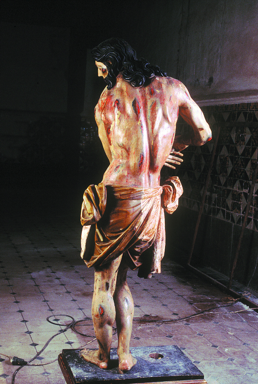 La madera presentaba pequeñas grietas y juntas abiertas. En la película pictórica se observaban cuarteados, gotas de cera y algún brochazo de purpurina en la parte central inferior de la columna, así como desgaste y rozamiento en la peana. En el paño de pureza se conservaba una gruesa capa oscura de betún que había sido aplicada a toda la escultura, según se aprecia en fotografías antiguas, pero que ya había sido retirada de las carnaciones. Por último señalar un antiguo ataque de insectos xilófagos en la peana.