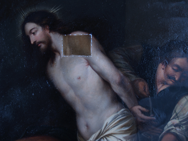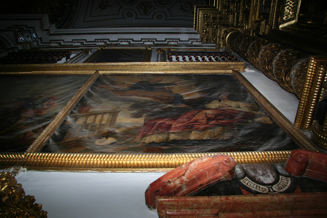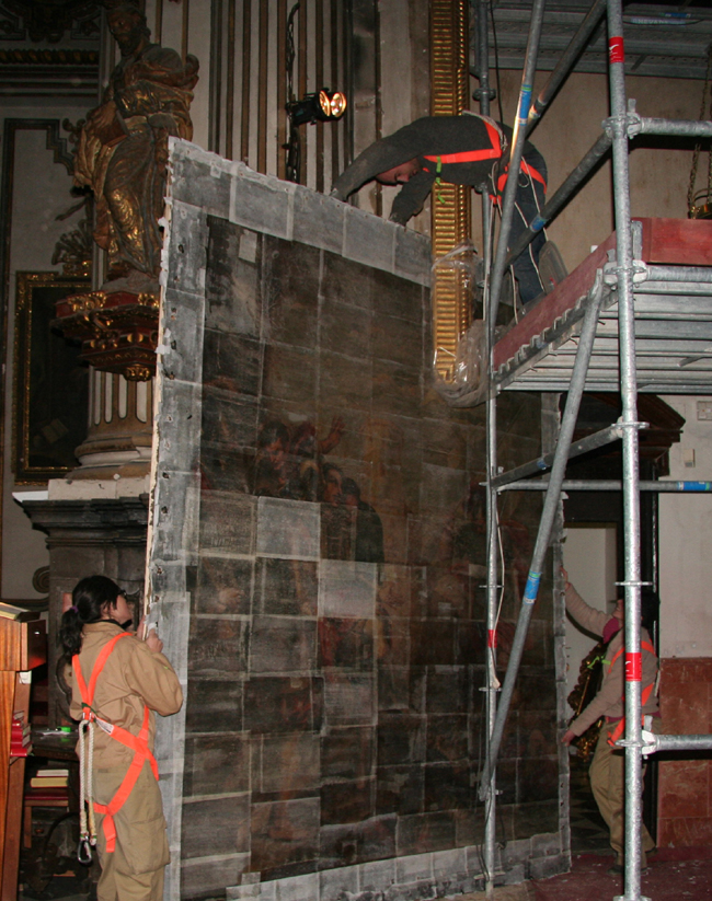 En cuanto a la serie de lienzos de la vida de san Ignacio de Loyola situados en los laterales del presbiterio, estos presentaban un deficiente estado, destensados y oscurecidos. Los cuatro lienzos de gran formato de la parte inferior estaban directamente clavados al muro. Su posición bajo dos balcones en contacto directo con los marcos, había contribuido en gran medida a su deterioro.