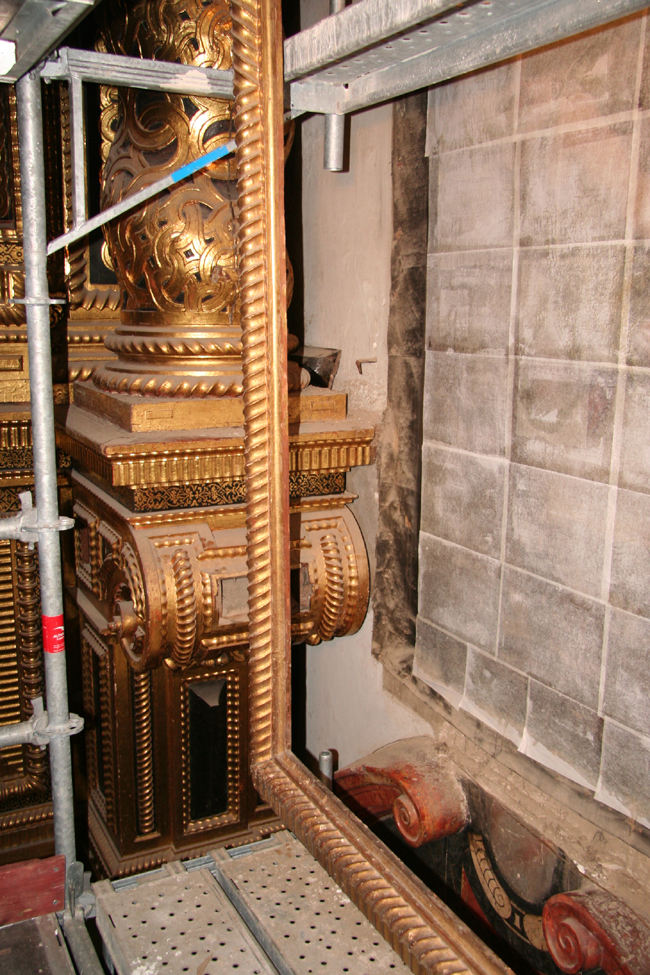 Un aspecto fundamental de la intervención consistió en recuperar el conjunto pictórico completo de Bocanegra devolviendo los cuatro lienzos que estaban descontextualizados a su primitiva ubicación en el retablo y restableciendo su original funcionamiento como elementos iconográficos escamoteables. Esto requería una serie de obras en el espacio trasero del retablo para acondicionar el acceso a los dos lienzos del cuerpo inferior, permitir su manipulación y posibilitar así su deslizamiento a través de las ranuras del retablo. Las obras consistieron en la eliminación de un recrecido moderno que impedía el recorrido vertical del lienzo del lado del Evangelio y la colocación de una sencilla estructura a base de tablones y pies derechos de madera para restablecer el nivel original desde el que se accedía por el reverso al lienzo del lado de la Epístola.