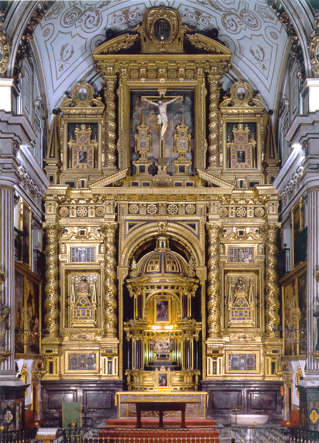 Los retablos del crucero se ejecutaron, salvo en su policromía y dorado, en la década de 1640. En la arquitectura del retablo mayor se trabajó desde, al menos, 1650 hasta 1664, distribuyéndose por ella diversos elementos pictóricos y escultóricos además de una serie de relicarios. Los relicarios, parte de ellos en dos esculturas de busto, y quizá el Crucificado del ático, del estilo de Pablo de Rojas, son piezas rescatadas de un retablo precedente inaugurado en 1610. En el manifestador se colocaron una serie de pinturas flamencas sobre cobre y seis esculturas, de las que cuatro, las de los Evangelistas, se atribuyen a Pedro de Mena. Por último, los lienzos que completan el conjunto, obra del pintor Pedro Atanasio Bocanegra, fueron pintados entre 1663 y 1679.