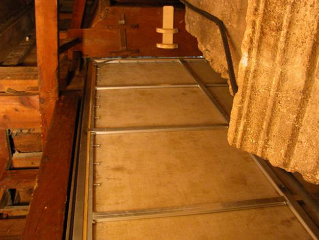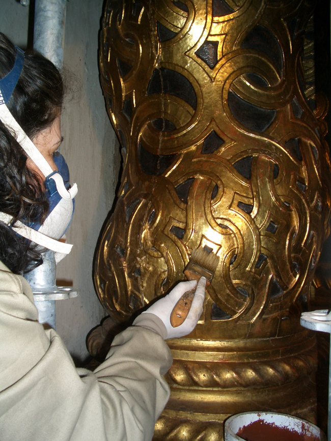 Garantizar el paso seguro de los lienzos a través de las ranuras del retablo por las que éstos se deslizaban presentaba una cierta complejidad técnica, pues las ranuras se habían deformado y estrechado con el paso del tiempo por el propio movimiento natural de la madera. La solución adoptada consistió en instalar unas guías para garantizar un desplazamiento seguro de las pinturas, eliminando la posibilidad de golpes y roces, y montar los lienzos sobre bastidores metálicos móviles con una sección muy reducida, lo que permite que estén perfectamente tensados en todo momento y que se desplacen con una cierta holgura.