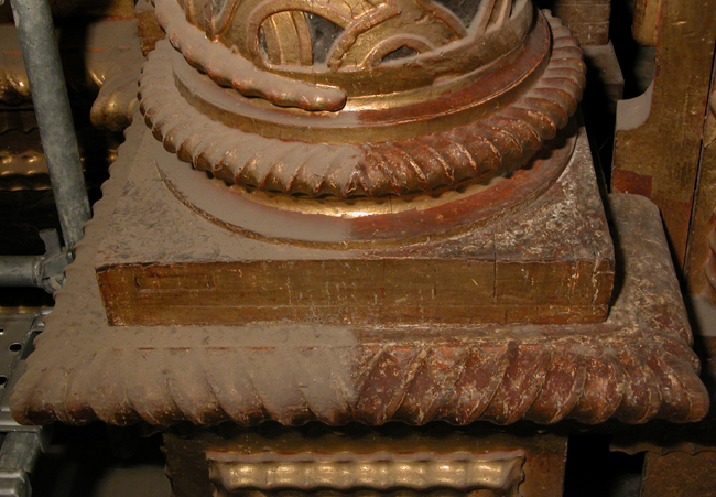 Antes de la intervención de la Consejería de Cultura se mantenían operativos los sistemas giratorios del manifestador y del ático, pero no el de los lienzos de las calles laterales, que no estaban colocados en el lugar para el que fueron pensados, sino en las capillas del templo.