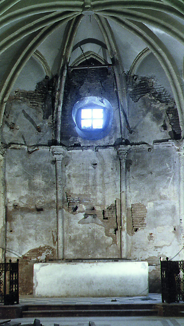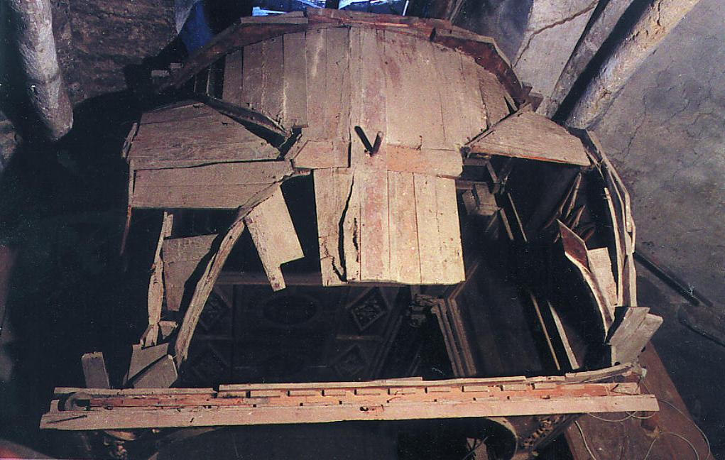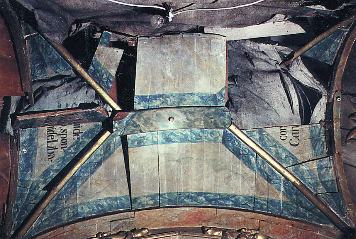 En cambio, toda la caja del camarín estaba desplomada hacia delante. A esto se sumaba una fuerte desnivelación hacia la izquierda y el hundimiento de la bóveda del camarín, que había ocasionado la pérdida de numerosas piezas.