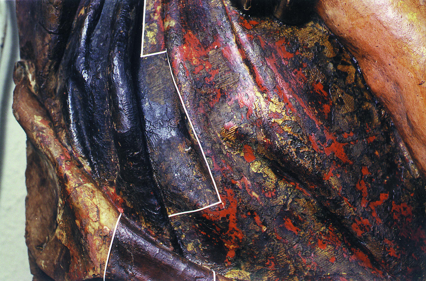 Después de asentar y fijar la base de preparación y la policromía se procedió a eliminar la gruesa capa de barniz pigmentado y el resto de estratos ajenos a la superficie original. Se reintegraron solamente aquellas lagunas cuya existencia perjudicaba la visión del conjunto. Finalmente se dio una capa de protección con resina acrílica.