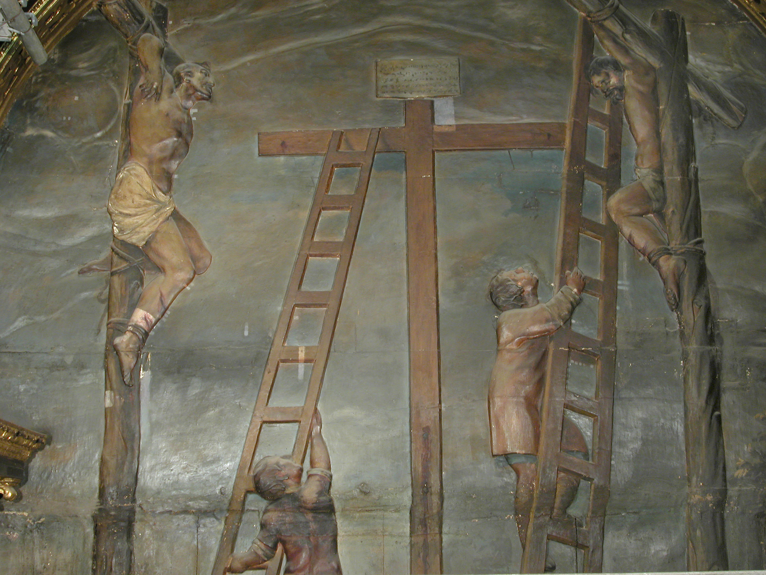 Se estucaron las faltas que distorsionaban la visión general del retablo. Tanto las lagunas de color como las de dorado se reintegraron con acuarelas y pigmentos al barniz aplicados con la técnica del punteado. En las faltas de mayor tamaño del relieve del Calvario se empleó el rayado. Las faltas por erosión o desgaste que resultaban agresivas visualmente fueron entonadas con veladuras de acuarela. Finalmente se aplicó una capa de protección excepto en las carnaciones de las esculturas, que conservaban en buen estado su satinado original.
