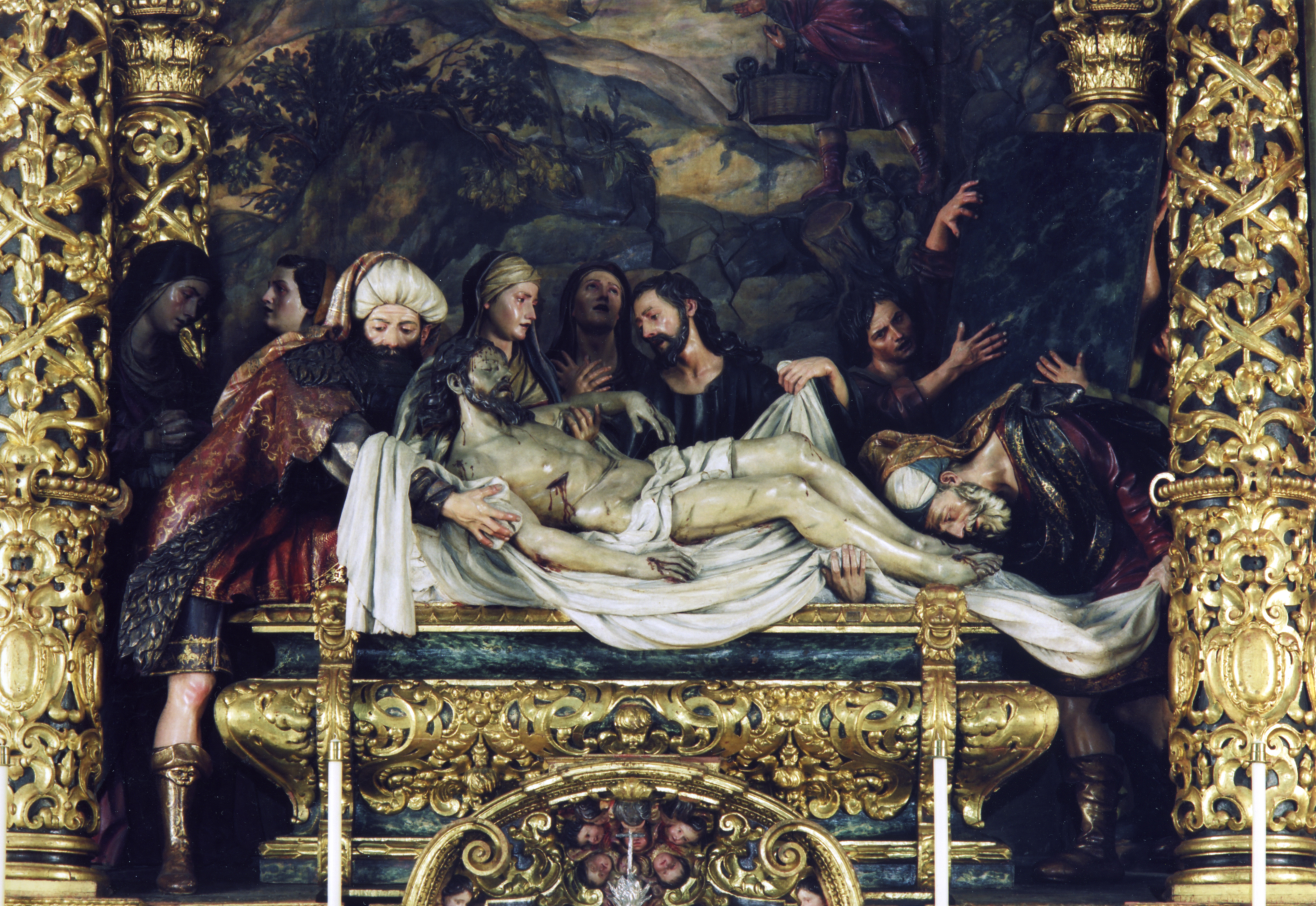 En las calles laterales se han dispuesto unos pedestales y hornacinas con arco de medio punto y remate desarrollado en vertical en el que se integran una venera, un querubín y un angelito. En las citadas hornacinas se encuentran situadas las esculturas de San Jorge y San Roque. Sobre los capiteles de las salomónicas descansa un amplio y quebrado entablamento, reforzando la sensación de movimiento del retablo. Una volada cornisa lo remata. El baldaquino central está constituido por dos columnas y dos semicolumnas de menor tamaño y no alineadas con las delanteras. Apean sobre sus capiteles dados de entablamento con ménsulas y sobre estos unos pedestales. De ellos arrancan los arcos. Sobre pechinas se dispone una bóveda que pretende ser oval, pero que resulta interrumpida por el arco frontal y que además aparece inclinada hacia el fondo. Tal solución es parte del juego de perspectiva que origina la presencia de soportes de distintos tamaños no alineados que procura dar la impresión de un espacio más amplio al que realmente existe. Bajo la bóveda se cobija la escena del Entierro de Cristo. Sobre una volada y quebrada cornisa que se alza sobre el arco frontal del baldaquino se halla el ático, centrado por un gran medallón con la alegoría de la Caridad. A ambos lados se disponen la Fe y la Esperanza. Ángeles, cartelas y florones componen el resto de la decoración. El ático se cierra mediante una moldura que se adapta al arcosolio y en la clave una cartela que enlaza con los yesos de la bóveda.