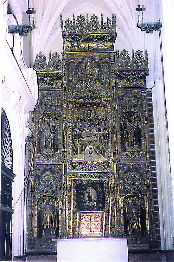 En el primer cuerpo, las hornacinas de las calles laterales albergan las imágenes de San Ambrosio y San Agustín. La calle central es producto de una serie de añadidos y transformaciones. En ella se sitúan el sagrario, cuyas puertas son dos tablas de fines del siglo XV que representan la escena de la Anunciación, y un lienzo de la Inmaculada del siglo XVII. Ambos elementos ocultan una hornacina decorada con pinturas murales en los paramentos verticales y en la bóveda. Un marco adornado con cabezas de querubines y el Dios Padre delimita toda esta zona.