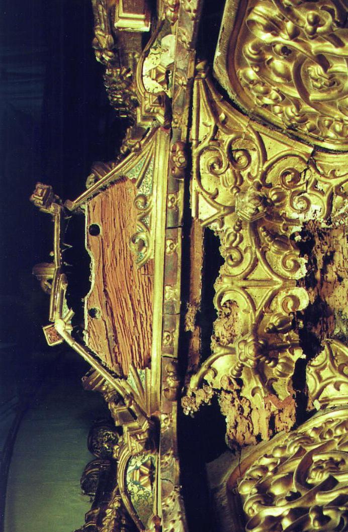 Todas estas circunstancias habían propiciado un feroz ataque de xilófagos -hongos, termitas y carcoma- que afectó a la casi totalidad del retablo, sobre todo a los elementos de sustentación. A consecuencia de esto el conjunto presentaba una elevada inestabilidad estructural, disgregación de la madera, pérdida de adherencia entre las capas, disgregaciones y pérdidas de dorados y policromía, cuarteados y formación de lascas.