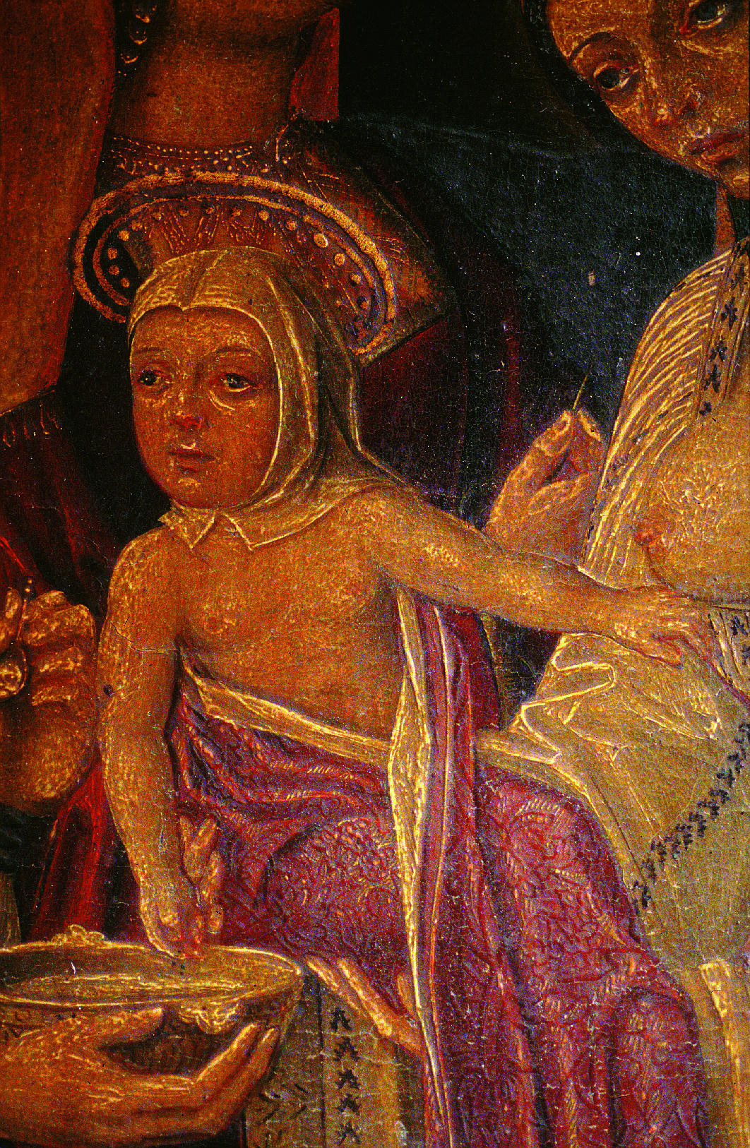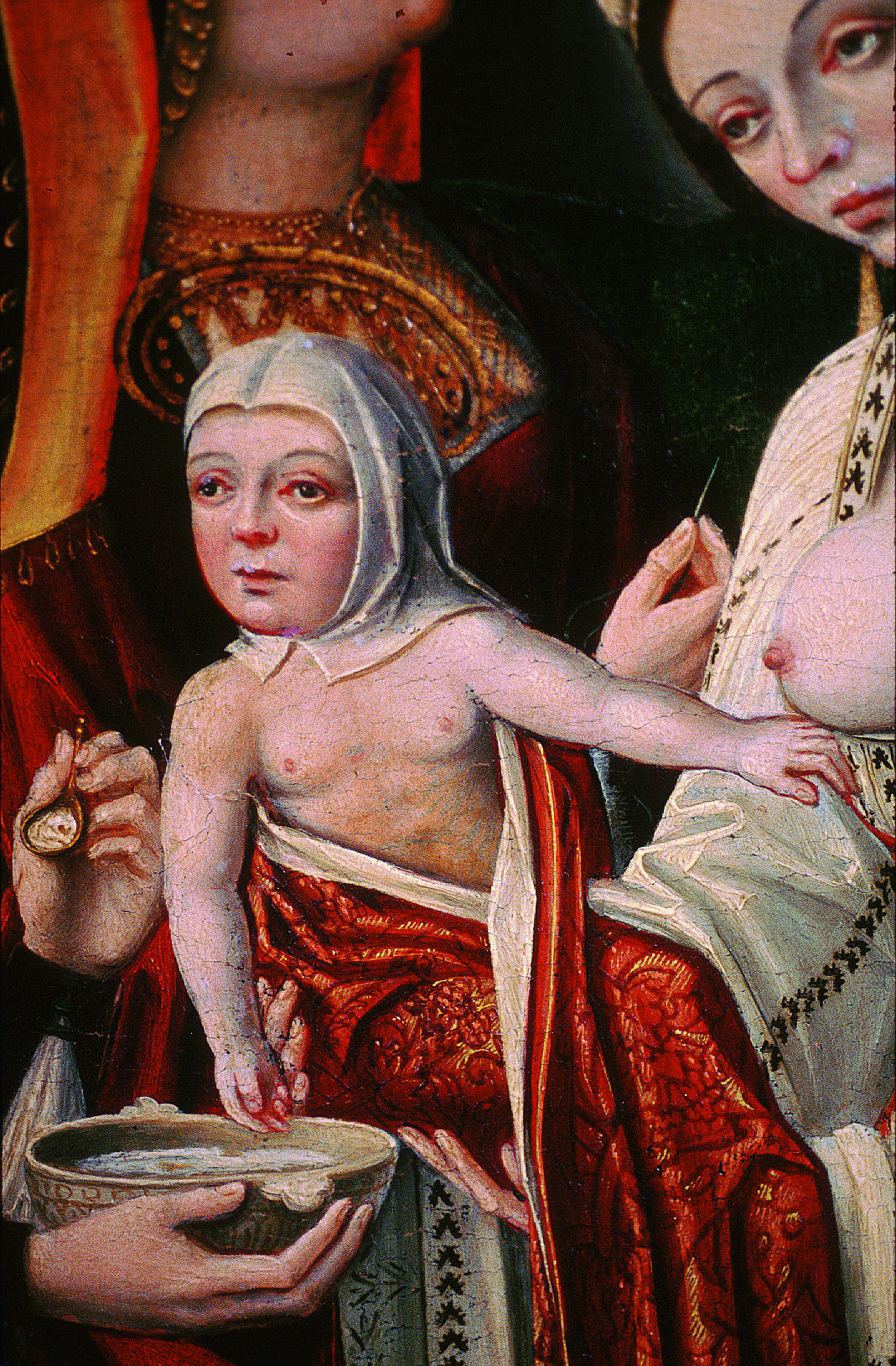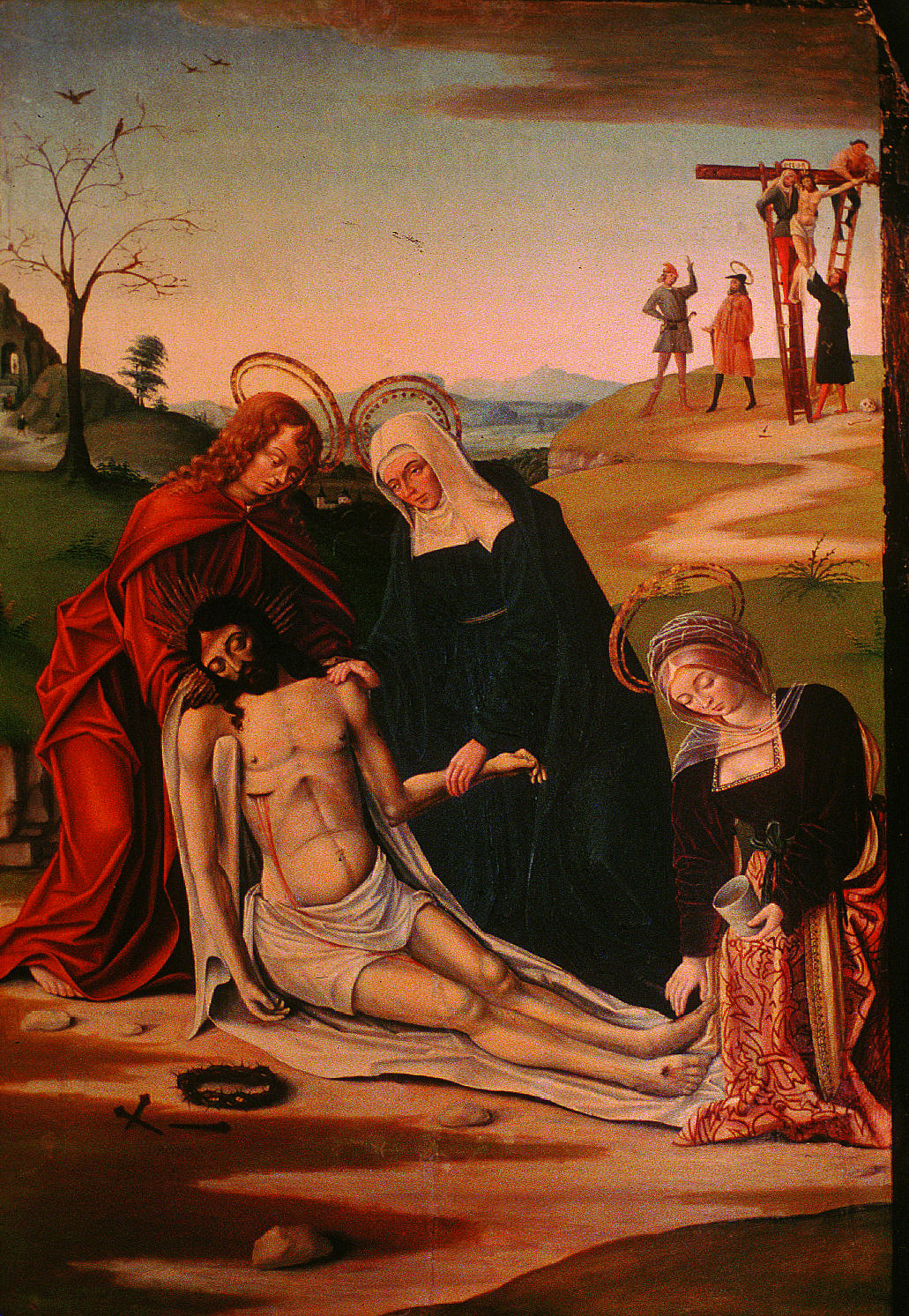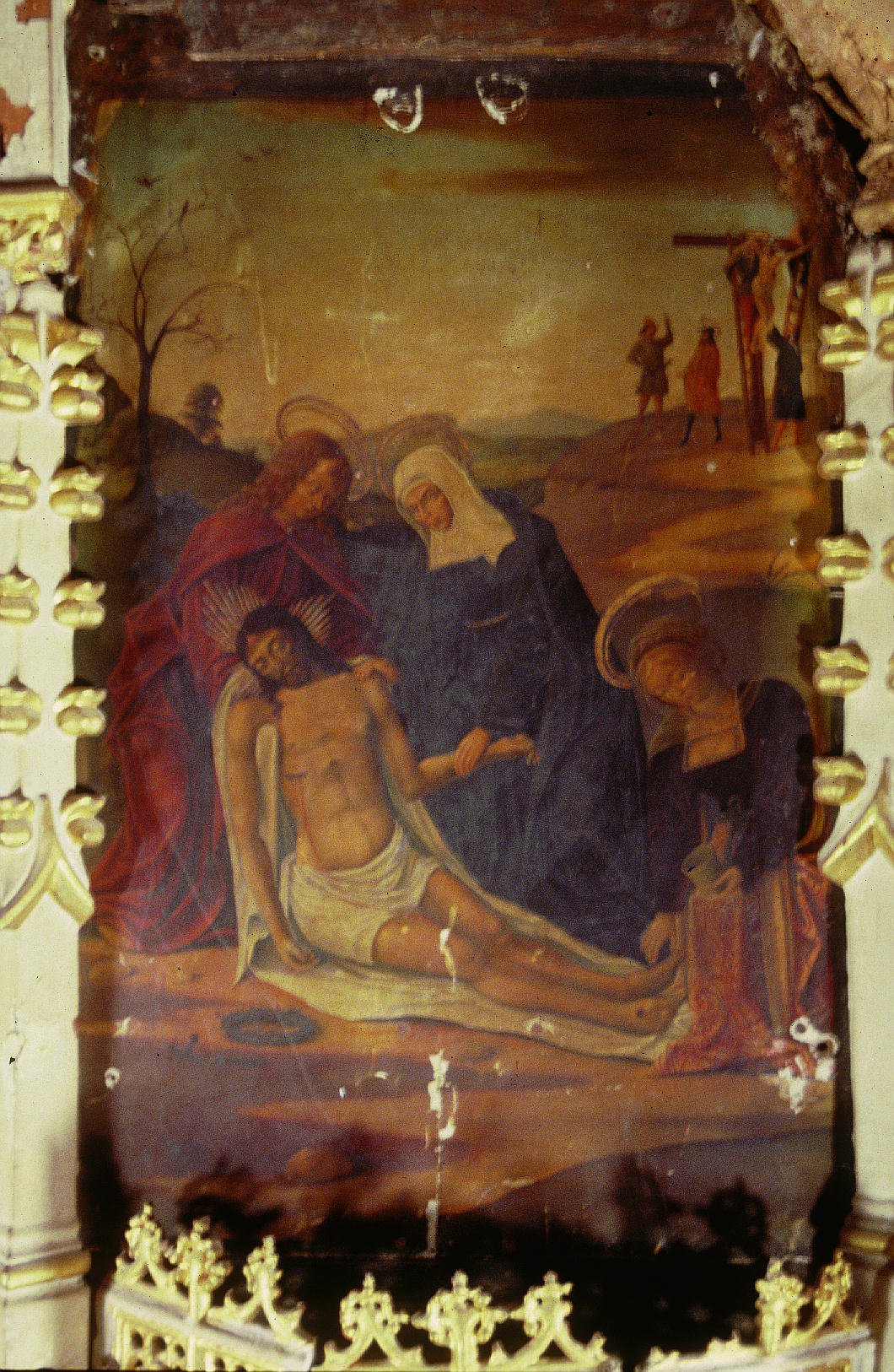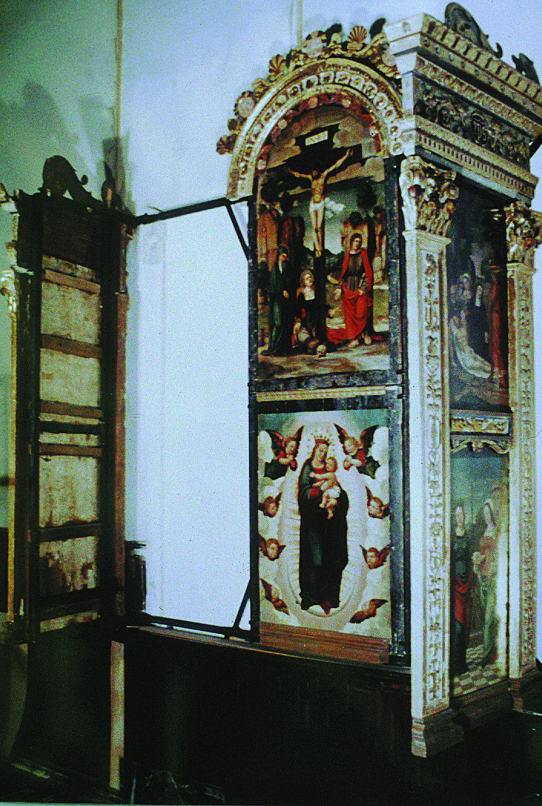 En el reverso de la tabla de la Piedad se localizó la leyenda “se restauró” junto con la fecha “8-10-40" a lápiz. Fruto de esta intervención era la convivencia de zonas de acumulación de suciedad con otras con el estrato pictórico barrido. Las numerosas pérdidas de preparación se habían pretendido ocultar con una fina pintura oleosa aplicada directamente sobre la tela, salvo en la tabla de la Virgen con el Niño, donde la reintegración de las lagunas se había realizado con cera. Ésta, incompatible con los materiales originales, produjo cazoletas; además la reintegración cromática realizada sobre ella presentaba tonos opacos que contrastaban vivamente con el original.