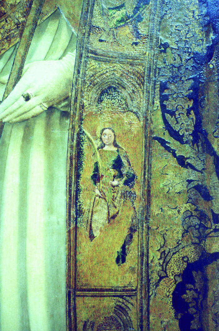 Según se ha puesto de manifiesto en la restauración efectuada, las tablas de la Presentación del Niño y la Huida de Egipto son falsificaciones de las originales. Su sustitución se efectuó después de 1961, como lo demuestran fotografías de la época. El estudio de las maderas demostró que en las tablas falsificadas la presencia de anillos, vasos y densidad eran menores que en las auténticas, su técnica de ejecución era diferente y poseían elementos, como el bario, cromo y cinc, descubiertos en el siglo XVIII y comercializados a partir del XIX.