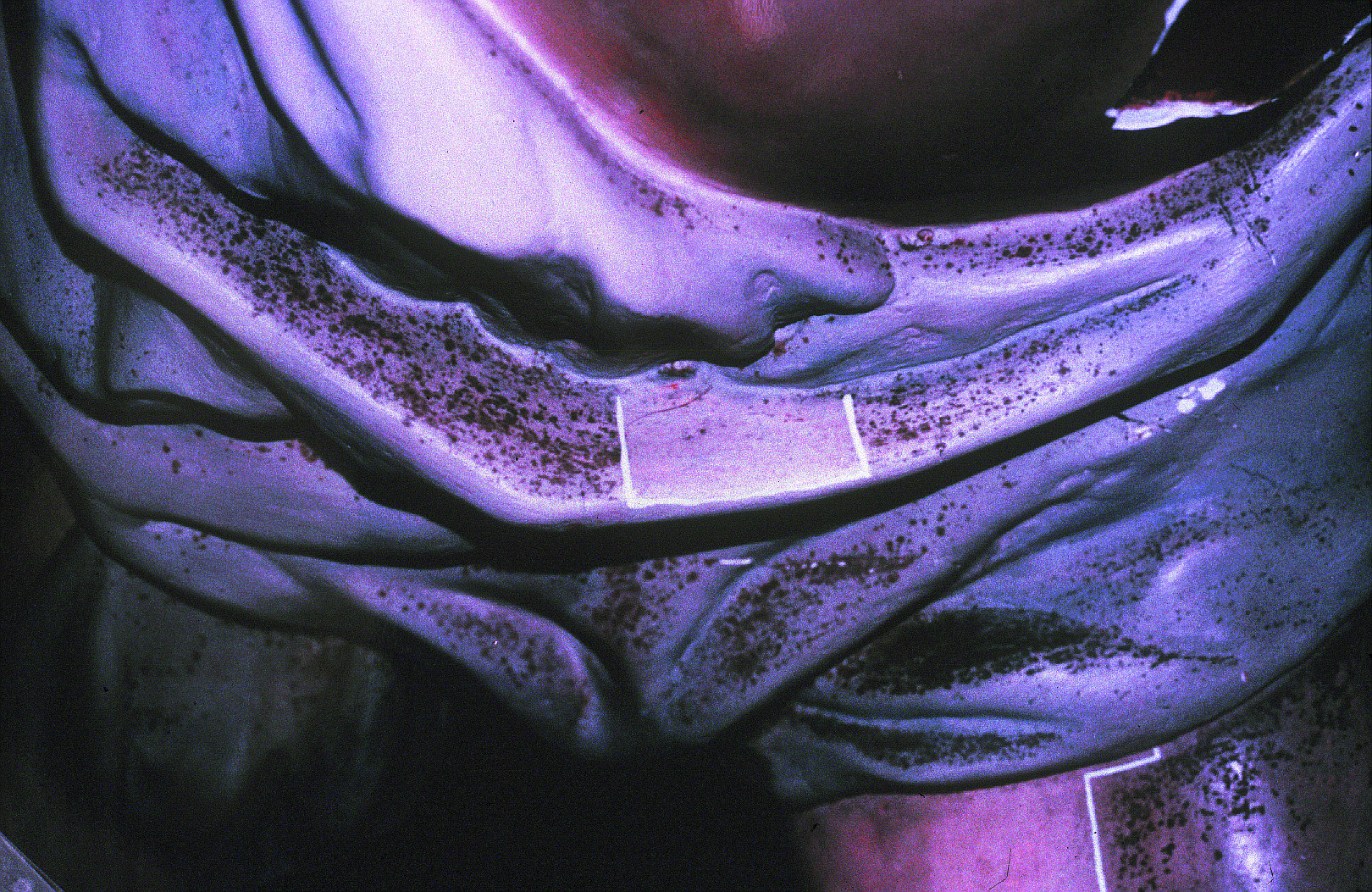 Los análisis efectuados permitieron constatar que, bajo la capa más moderna de policromía existía otra más antigua en algunas zonas de las manos y cara, con una preparación elaborada con carbonato cálcico. En las radiografías se advertían abundantes pérdidas en esta capa de preparación. En las manos y brazos aparecía una segunda capa de estuco, aplicada en 1938 para policromar por completo unificando con el color del resto del cuerpo. También se observaban repintes de óleo con intención de disimular las roturas de los dedos. El rostro estaba asimismo repintado, aunque directamente, sin preparación superpuesta.