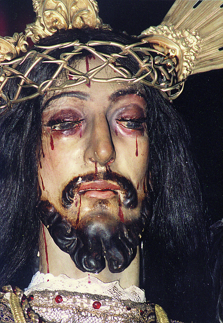 El sudario había sido cepillado por la parte posterior porque, al parecer, sobresalía demasiado al colocarle la túnica. La mano derecha tenía varias falanges rotas y mal pegadas, y el pie derecho también se había roto y pegado recientemente. El adhesivo utilizado fue, según la hermandad, una resina epoxídica. La cabeza estaba llena de agujeros pequeños de colocar antiguamente una corona de espinas y tres agujeros grandes, dos de ellos tapados con espigas, de unas potencias. Y en distintos puntos del brazo izquierdo se localizaban ataques de hongos de pudrición parda, hecho que podría estar relacionado con la noticia de que en el año 36 la cabeza y una de las manos fueron escondidas en una cesta en el interior de un pozo.
