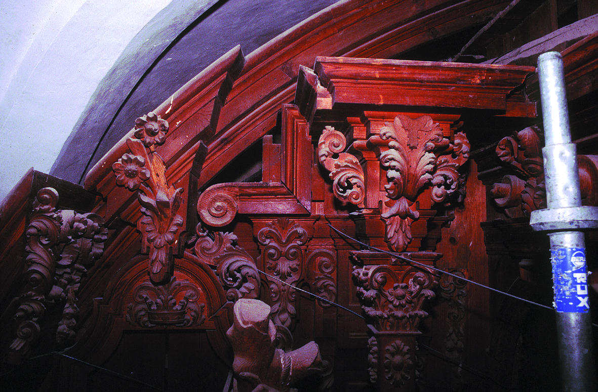 La mayor parte de los puntales de sujeción del retablo al muro estaban en pésimo estado. Esto, unido a la degradación de las colas, había provocado movimientos y ligeros desplazamientos de piezas. La situación era muy grave en el caso de la estructura superior del techo del camarín, cuya inestabilidad afectaba a todo un conjunto de piezas dependientes en la parte superior. Además la mayoría de las tablas de los nichos y hornacinas se encontraban agrietadas debido al tipo de ensamble, con travesaños clavados, que no se adaptan al movimiento natural de la madera. Ante los graves problemas de estabilidad, en intervenciones anteriores el arco principal se había apuntalado y los elementos del segundo cuerpo con mayor riesgo de caída, incluidas las esculturas, se habían sujetado con gruesos alambres fijados a unos ganchos de acero introducidos en el muro.