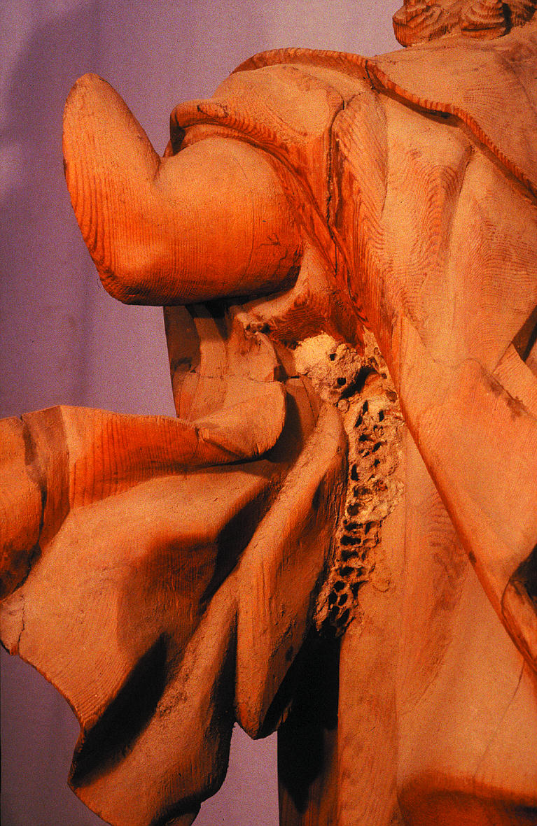 Las piezas agrietadas fueron tratadas con injertos de madera de balsa; las de mayor grosor, con cedro y balsa, en algunos casos reforzadas con toledanas de haya. Las uniones abiertas de tablas y, en general, de piezas que formaban entre sí módulos o conjuntos independientes, se limpiaron, se encolaron, se ensamblaron con espigas y se reforzaron también con toledanas de haya, al tiempo que se eliminaba, en su caso, el sistema de unión con barrotes clavados. Únicamente las piezas no decorativas de carácter estructural que se encontraban en pésimo estado de conservación hubieron de ser reemplazadas por otras de madera curada. Los clavos de hierro oxidados también se sustituyeron, en los casos de pérdida de función o degradación de la madera, por tornillos galvanizados o por espigas.