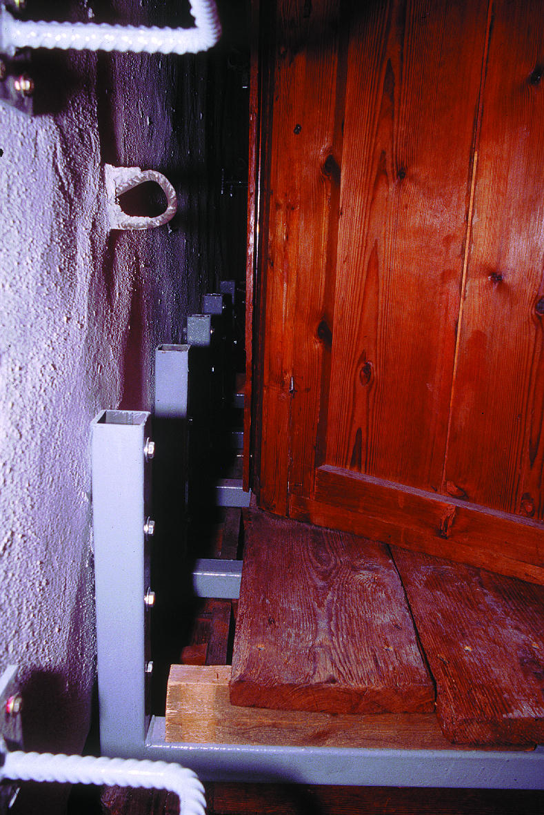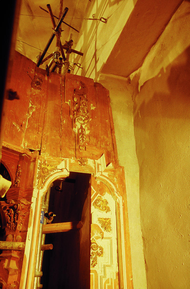 Durante el montaje del retablo se reforzó la zona superior del camarín con una estructura sustentante de hierro y se instalaron dos escaleras de gato. Los puntales antiguos, de rollizos de madera, fueron sustituidos por otros cortados a escuadra y sujetos al muro mediante piezas de acero.