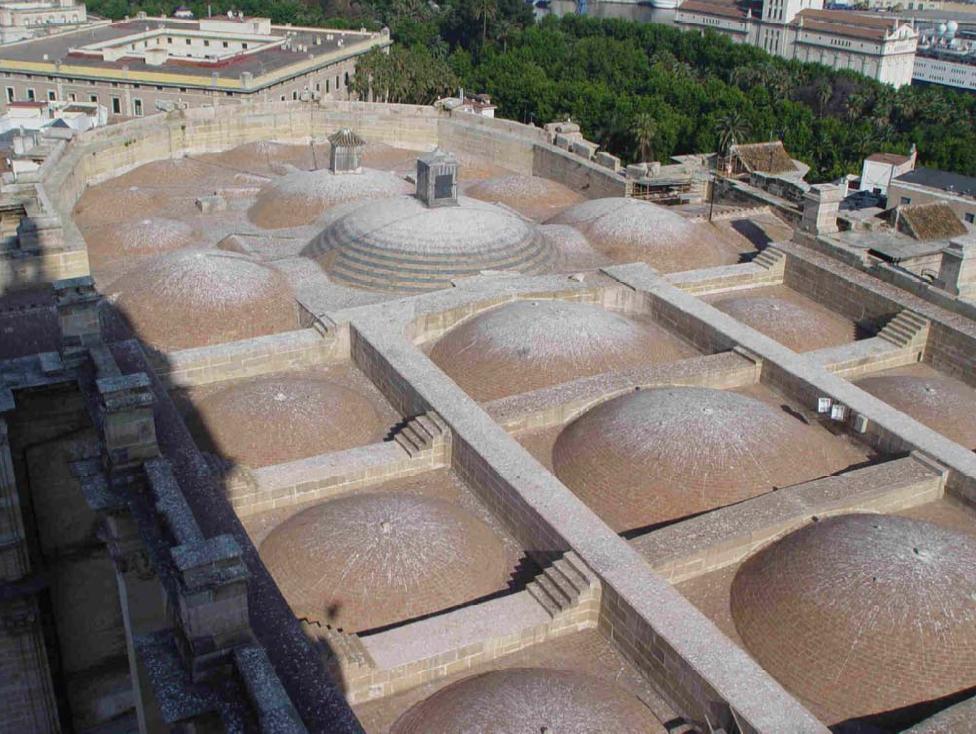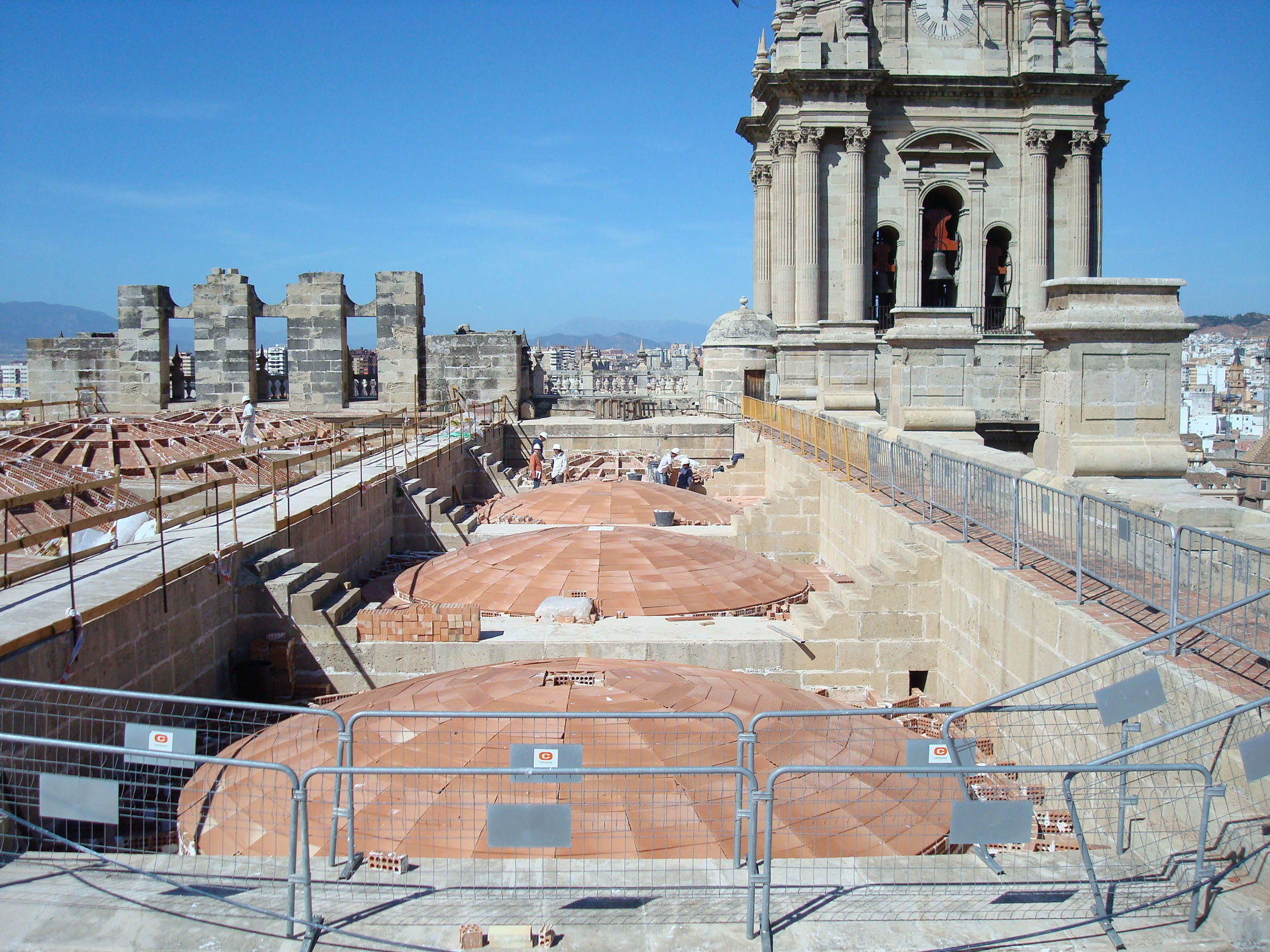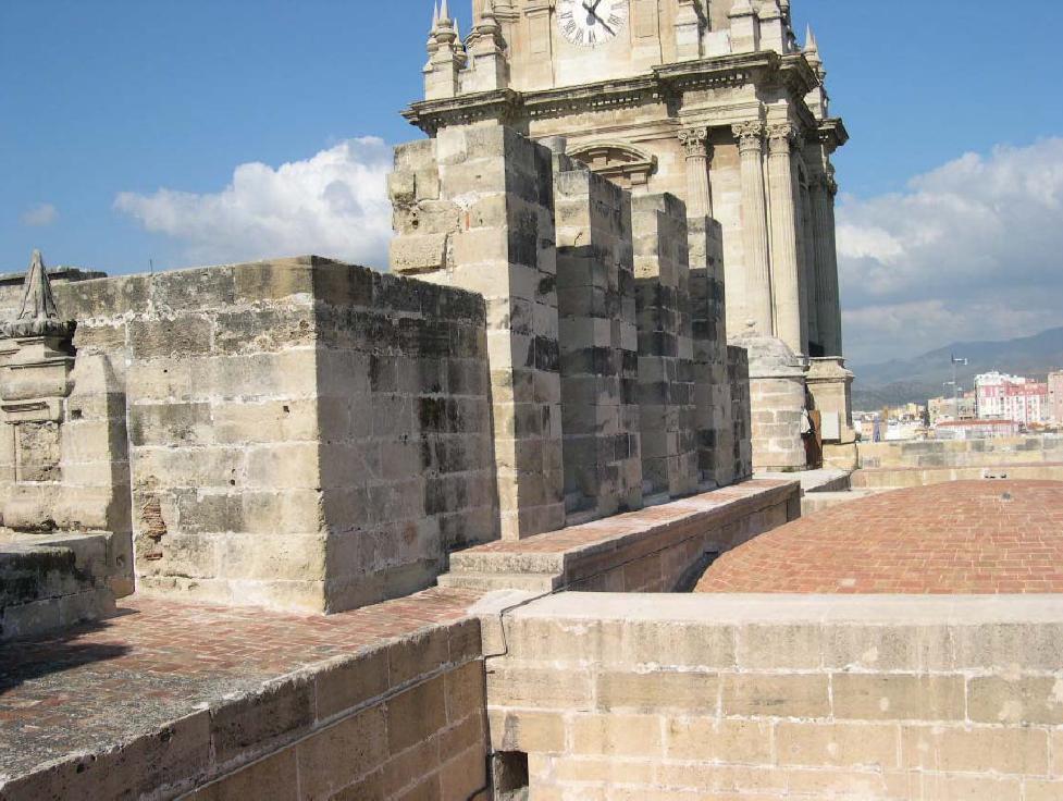 La cubierta que debiera proteger la Catedral de Málaga presenta las deficiencias propias de una obra inacabada. Las fábricas de piedra que componen las bóvedas y los rellenos de los riñones de las mismas están cubiertos exteriormente por una sola hoja de ladrillo, causante de filtraciones continúas.