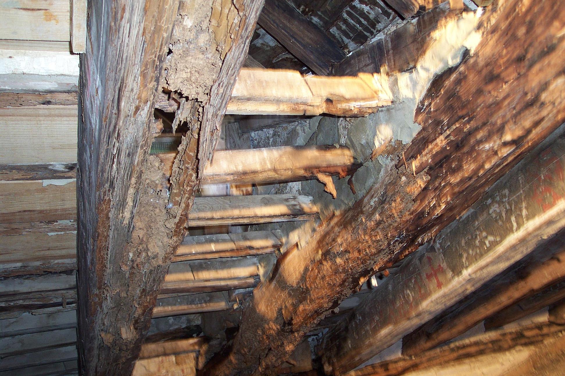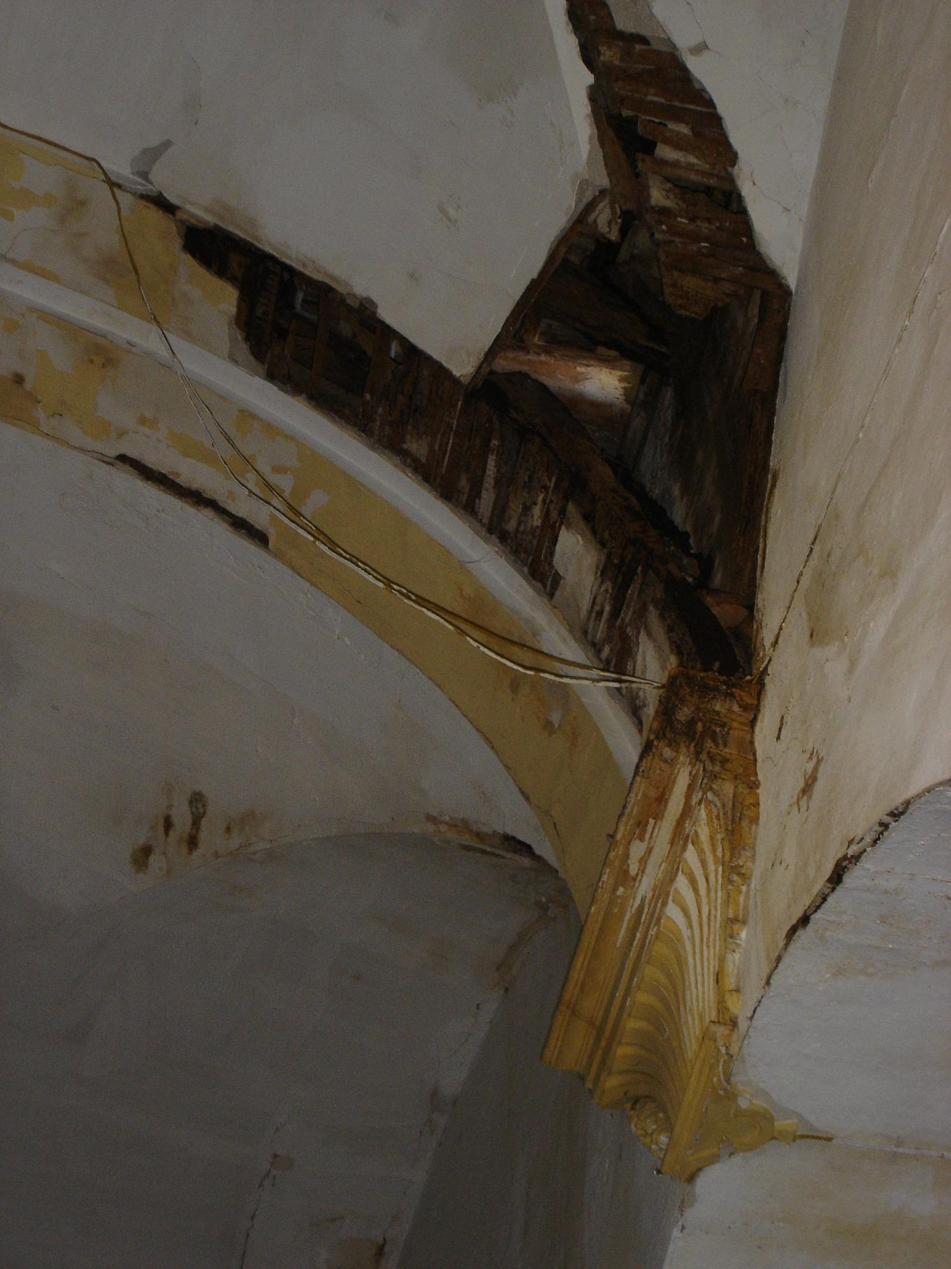 La cubierta de madera de la nave del Evangelio tenía un ataque muy generalizado de termita, lo que aconsejaba su desmontaje o apuntalamiento, ante el riesgo de desplome.