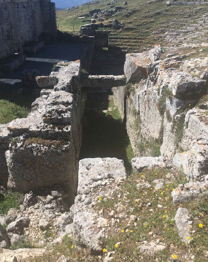 Existían también una serie de fracturas verticales que atravesaban por completo la roca que forma el frons pulpiti y conectan la orchestra con el foso existente bajo el pulpitum, que está a una cota inferior y que en cierto modo hace de sumidero.