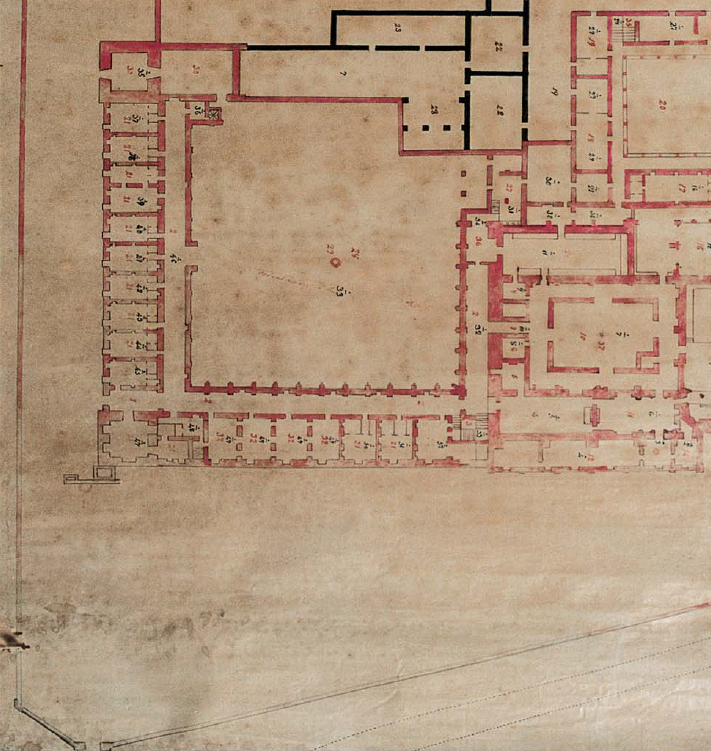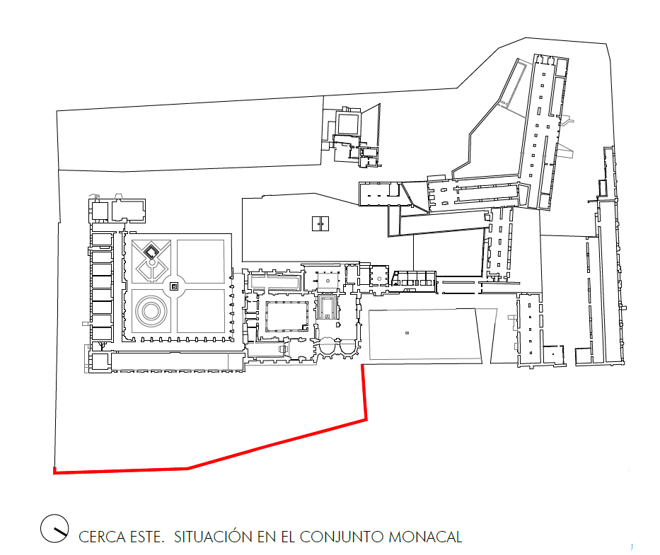 La cerca este, objeto de la intervención, se encuentra en el límite oriental del conjunto monacal, que está delimitado por un conjunto diverso de cerramientos.