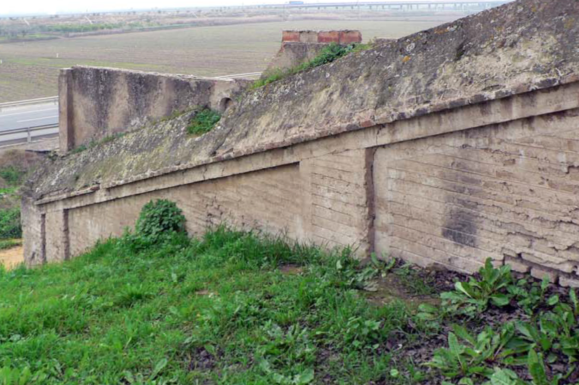 Murete de fábrica de ladrillo macizo (29 x 14 x 5 cms) revestido con revoco de cal apoyado sobre una zapata de hormigón armado HA-30.