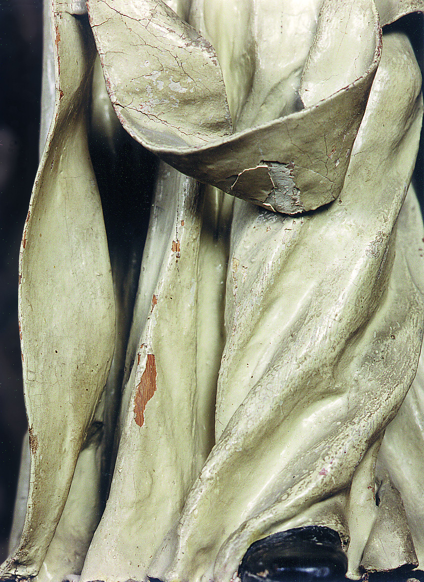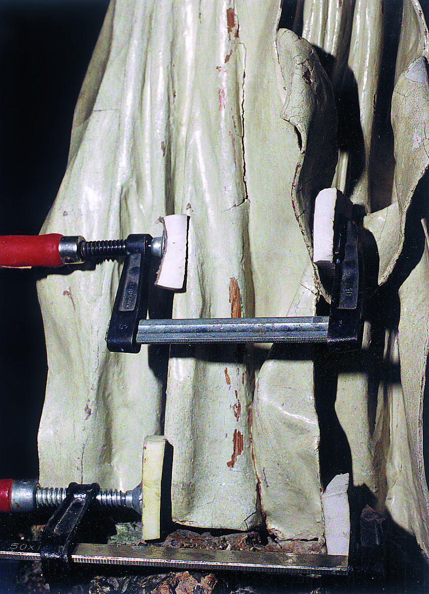 Las contracciones y dilataciones de la madera habían producido pequeñas grietas y la separación de algunas juntas de piezas con el consiguiente desprendimiento de las capas de preparación y pictórica de la zona circundante. Las grietas eran especialmente peligrosas en ambos lados de la mascarilla de la cara y en la parte inferior izquierda del escapulario.