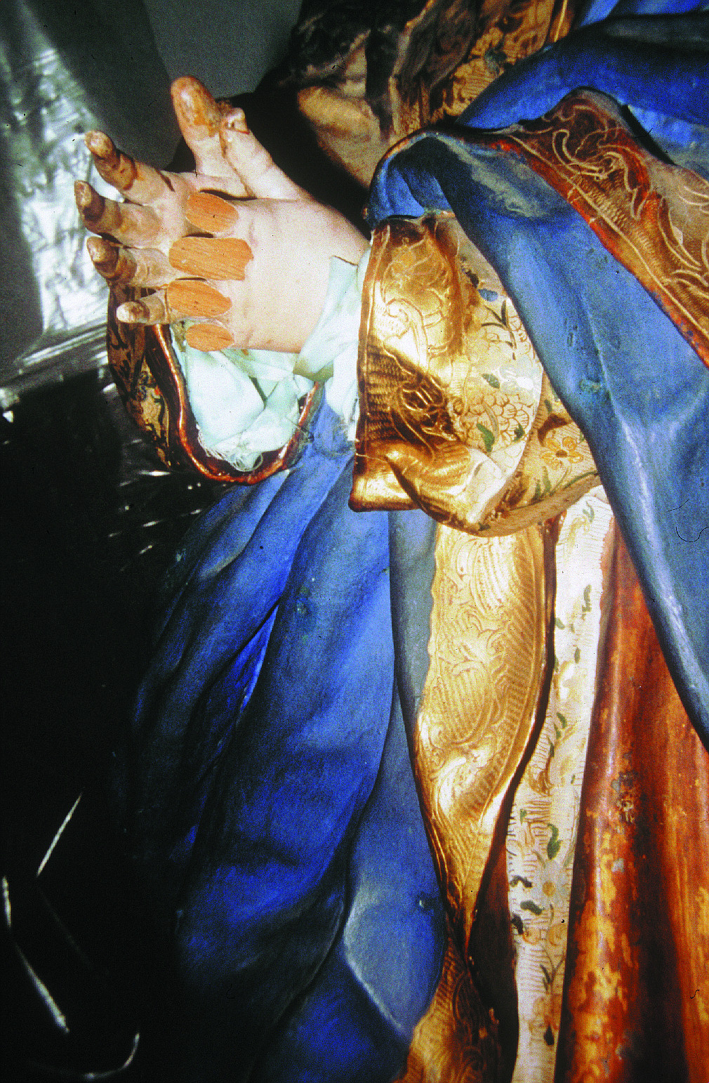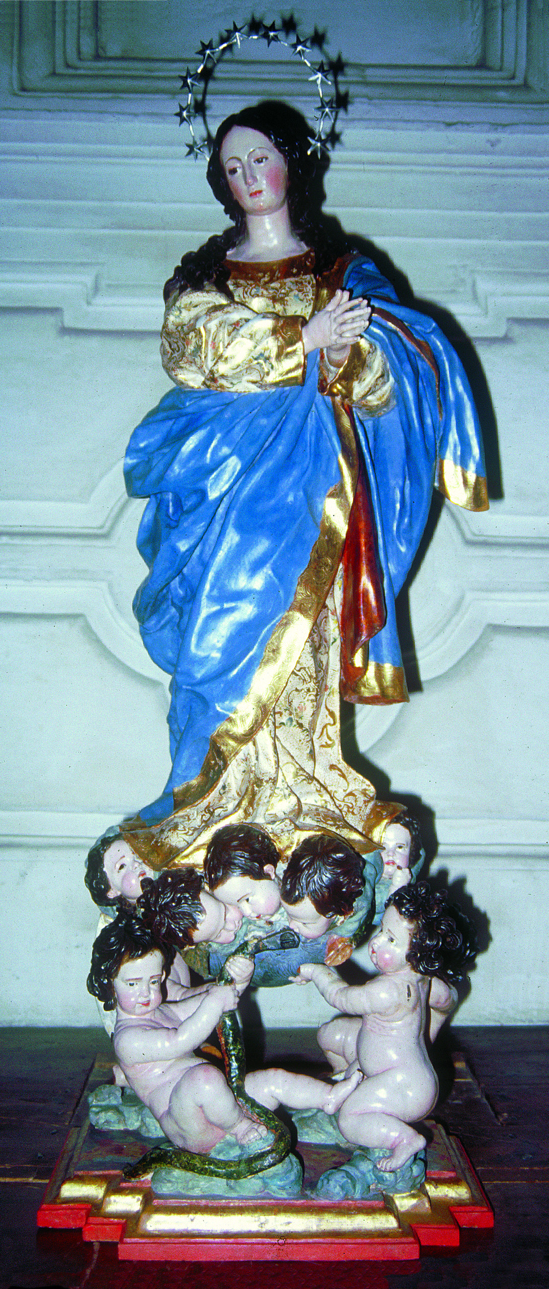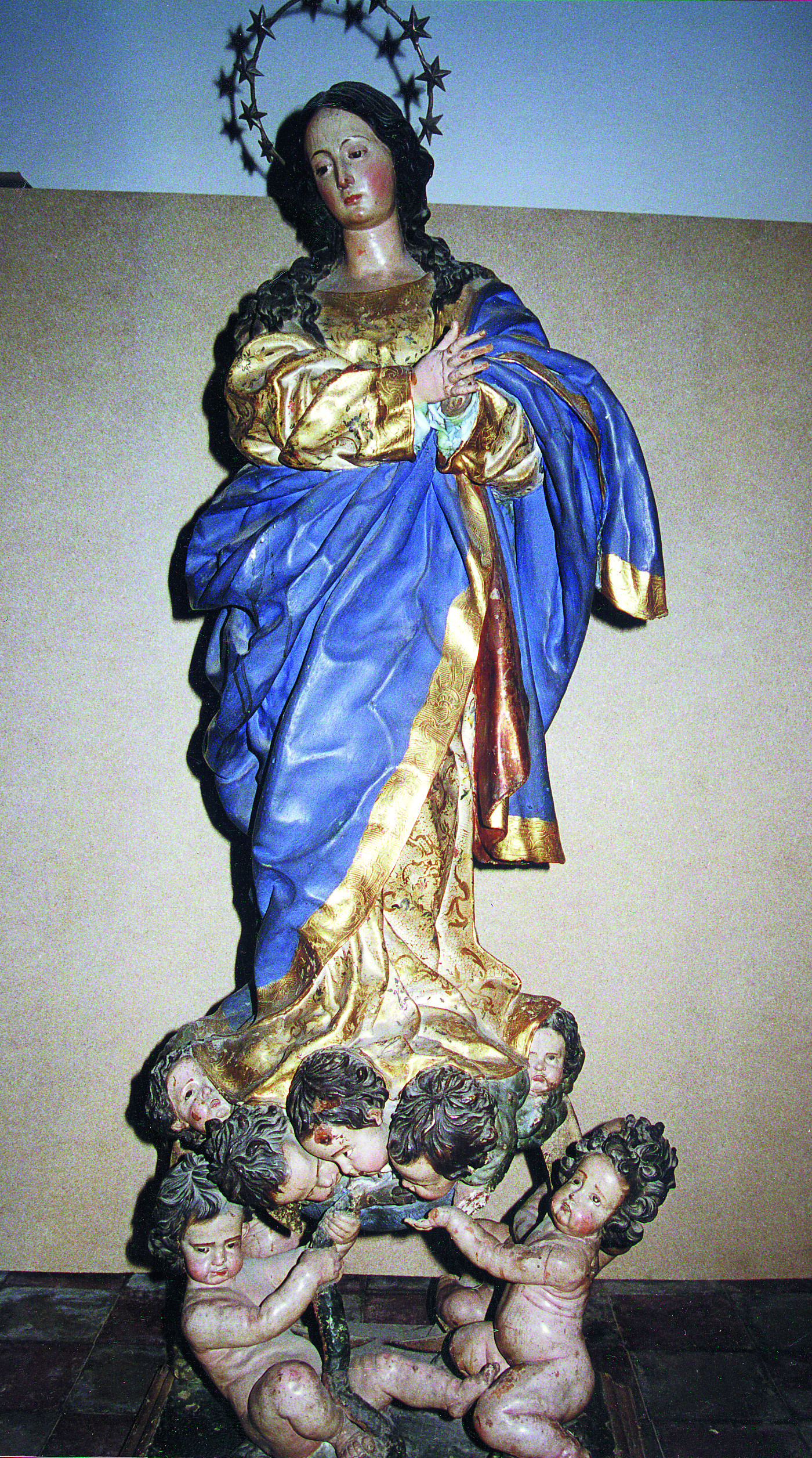 En el manto de la Virgen se advertían orificios originados por los alfileres y cáncamos que sujetaban las telas con las que en ocasiones se cambiaba el vestuario de la imagen. Aún más visibles eran las abolladuras, astillamientos y, especialmente, las pérdidas de fragmentos: cuatro dedos de la mano izquierda de la Virgen; bordes del manto; mutilaciones en los querubines y ángeles, entre otras la casi totalidad de las alas; cabeza y parte del cuerpo de la serpiente; estrellas del nimbo, etc.