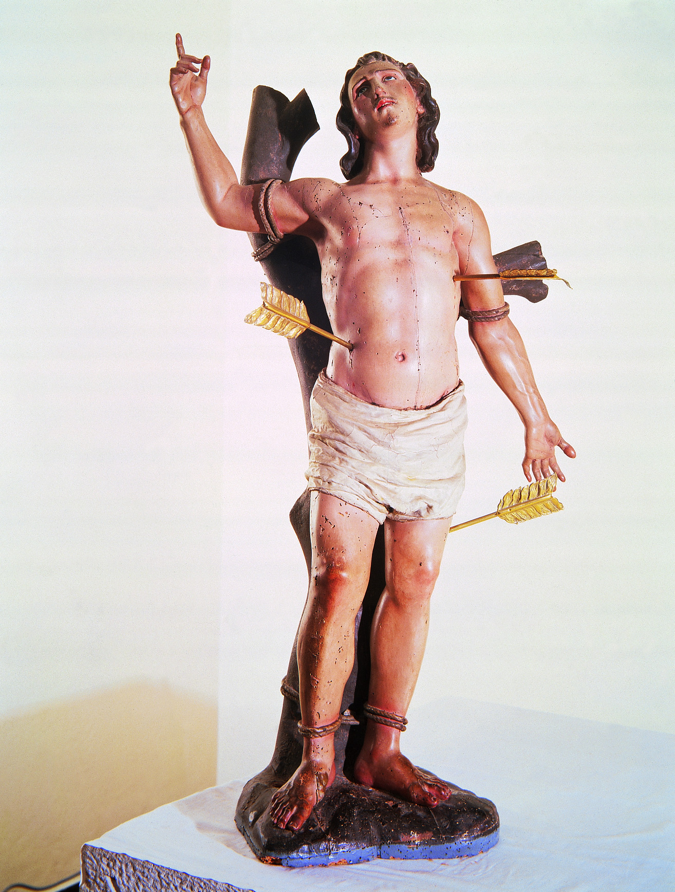 Sobre la policromía original se superponía otra de tonos más pálidos. En algunas zonas del rostro, antebrazos y manos podía adivinarse el estado de conservación de la más antigua, muy cuarteada y con muchas pérdidas. Una fina capa de cera permanecía en gran parte de la policromía entre ambas capas de color, como consecuencia de haberse tapado algunos agujeros de xilófagos con anterioridad a la aplicación de la segunda policromía. También se localizaban repintes sobre los rellenos de grietas.
