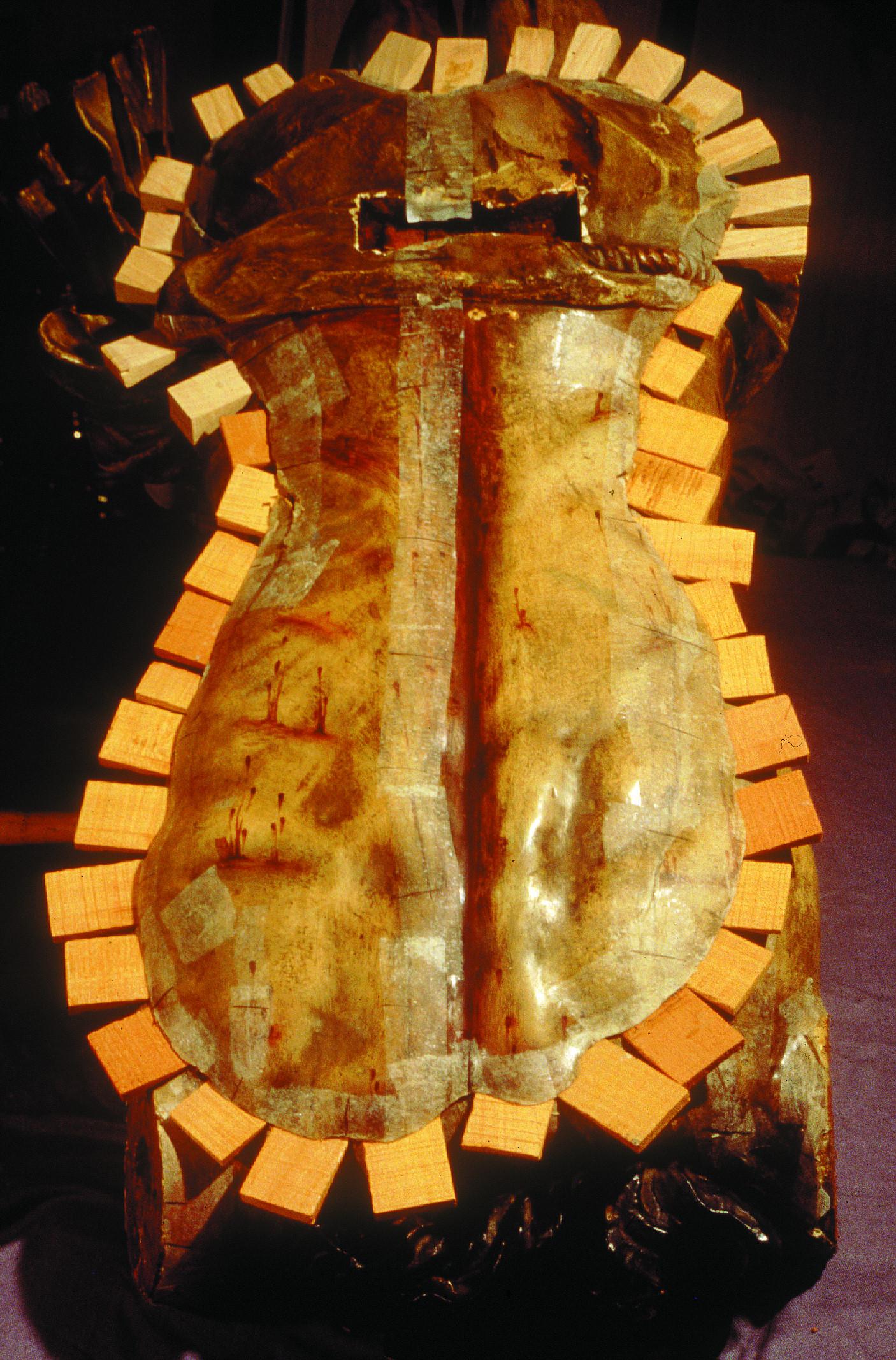 Una vez protegida la policromía en las zonas colindantes a los ensambles, se procedió a la separación de piezas -cabeza, brazos y tapa posterior del tórax- reblandeciendo los adhesivos e insertando cuñas. Todos los elementos metálicos aparecidos se eliminaron y se sustituyeron por espigas de madera de haya. En vista de que el sistema de sujeción a la cruz perjudicaba la conservación de la imagen, se realizó uno nuevo en acero inoxidable consistente en un tubo con rosca interior soldado a un disco, el cual se embutió en el plano inferior sobre el que descansa la tapa. También se aumentó la superficie de unión de la tapa al tronco añadiendo dos piezas de madera dispuestas a lo ancho ensambladas por sus extremos a los bordes del hueco interior del tronco. La zona que alojaba el antiguo anclaje se reconstruyó, al igual que una falange desaparecida de la mano derecha, y la unión de las dos piezas que forman la tapa se reforzó con toledanas.