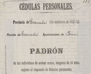 Título: Cédulas personales. Padrón de los individuos de ambos sexos, mayores de 14 años, sujetos al impuesto de cédulas personales. Partido de Granada. Término municipal de Jun.