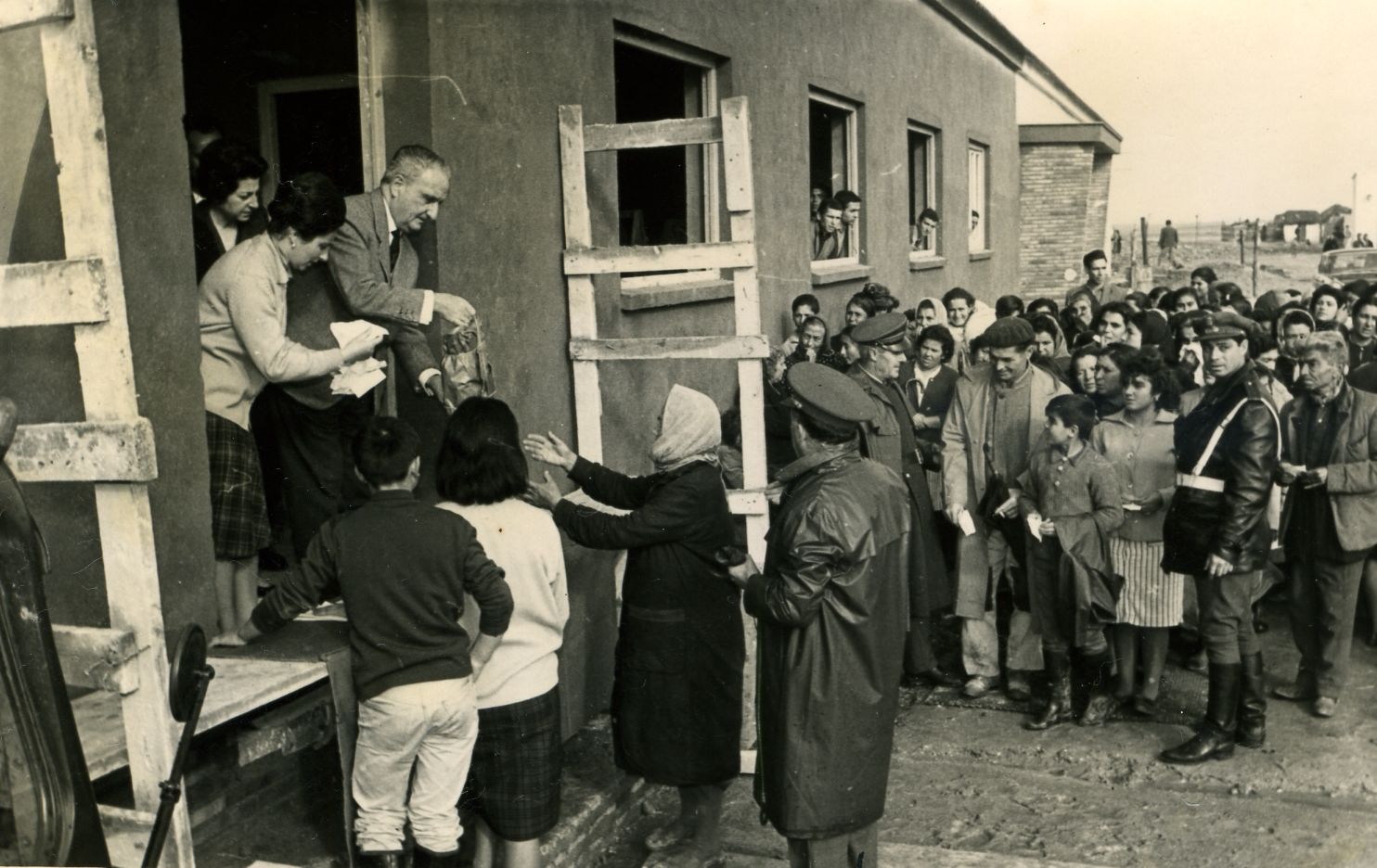 | Campaña de Navidad. Distribución de ropa. Fecha diciembre de 1964. AHPH.Colección fotográfica de la Sección Femenina, signatura F-015/0208. |
