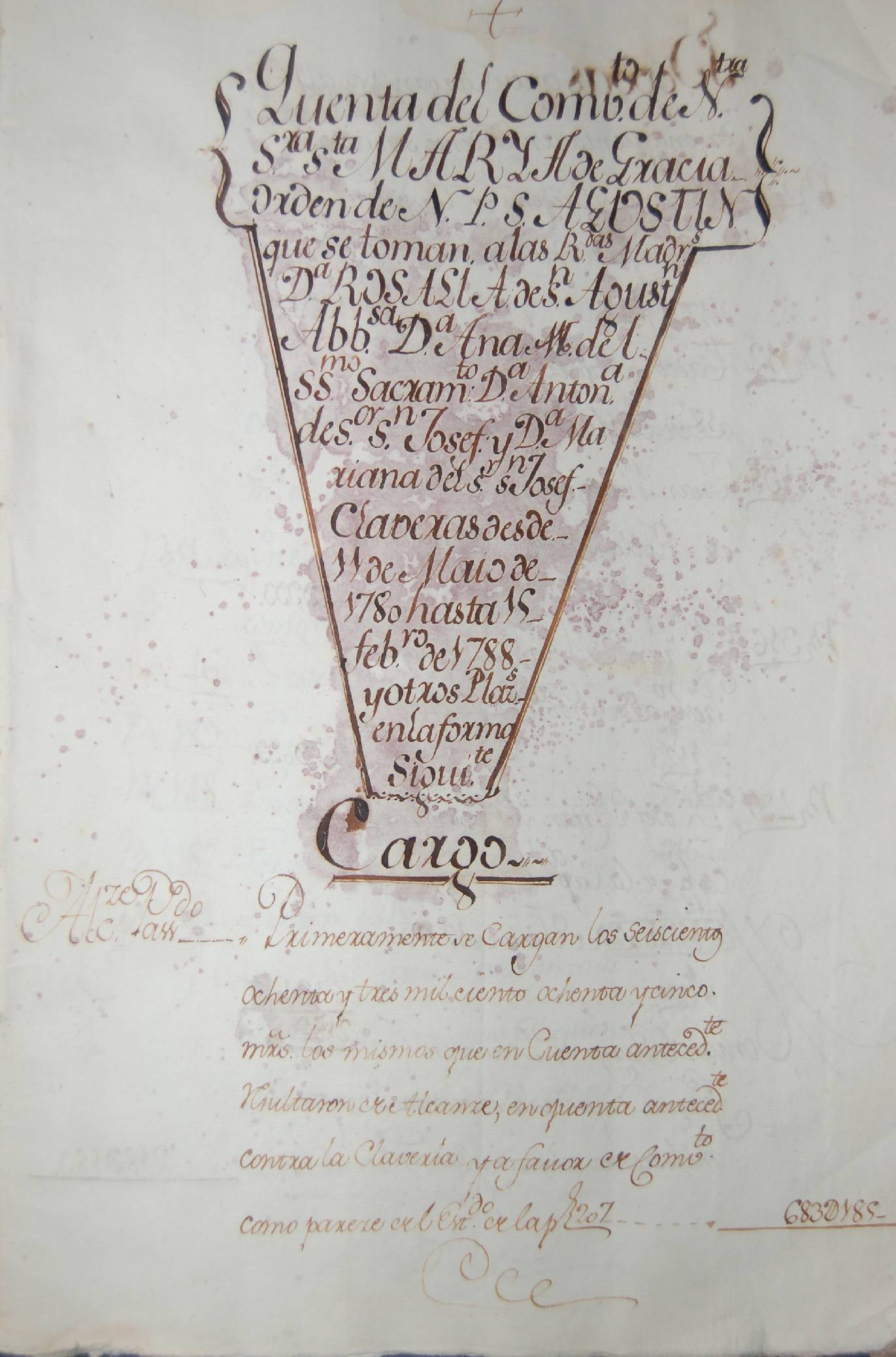 | Libro de cuentas del Convento de Santa María de Gracia, de religiosas Agustinas. Huelva. Año 1780-1788. AHPH. Fondos eclesiásticos desamortizados, signatura 05523/001. 08 |